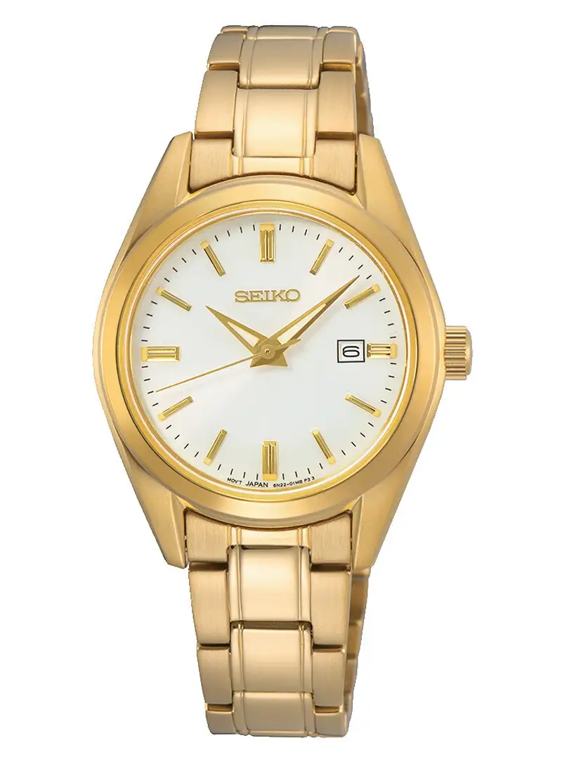 Seiko Classic SUR632P1 jsou dámské hodinky s výrazně šperkařským charakterem, v němž zlacená ocel podtrhuje eleganci a jemný lesk bílého perleťového ciferníku. Jeho subtilní odlesky se mění podle úhlu dopadu světla a vytvářejí efekt typický pro přírodní perly, což modelu dodává výjimečnou lehkost a ženský půvab.