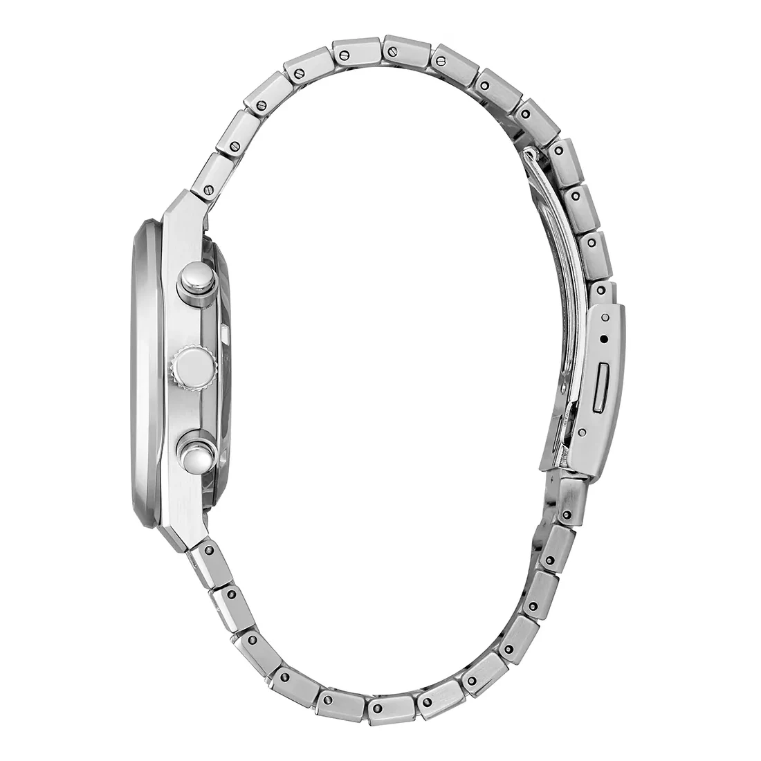 Kompaktní pouzdro hodinek je vyrobeno z ušlechtilé oceli a jeho průměr 40 mm zajišťuje pohodlné nošení jak na štíhlejším, tak i na robustnějším zápěstí. Model je osazen na plném ocelovém náramku s pevným spletem a klasickým zapínáním, což zvyšuje jeho odolnost a dodává mu výraznější charakter. Ciferník chrání minerální sklíčko typu Hardlex, které je odolné vůči poškození, a vodotěsnost do 100 metrů umožňuje bez obav používat hodinky i při kontaktu s vodou – například při plavání nebo silném dešti.