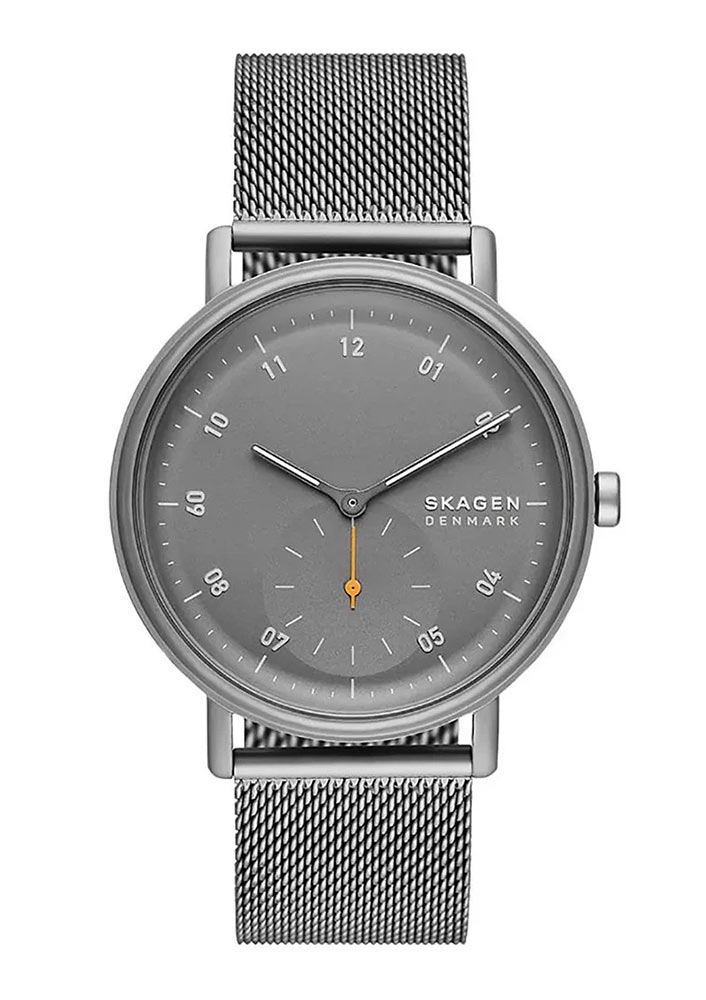Módní pánské hodinky Skagen na předním pásku jsou jištěny tvrdým minerálním sklíčkem. Okénko zakrývá šedý ciferník s dlouhými, subtilními ručičkami a lineárními indexy spárovanými s arabskými číslicemi. Na šesté hodině je subciferník s funkcí malé vteřinky. Malá sekundová funkce hodinek umožňuje přesné měření druhého času. To je také funkce, která celému designu dodává charakter a styl. Klasické pánské hodinky Skagen Kuppel jsou poháněny quartzovým mechanismem, který zajišťuje velmi dobré měření času.