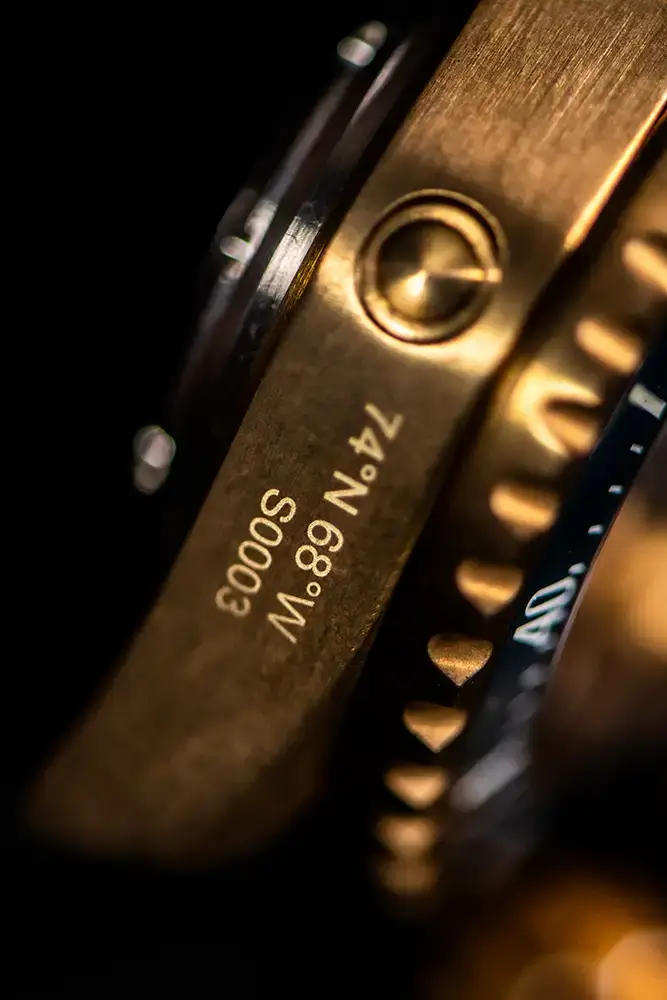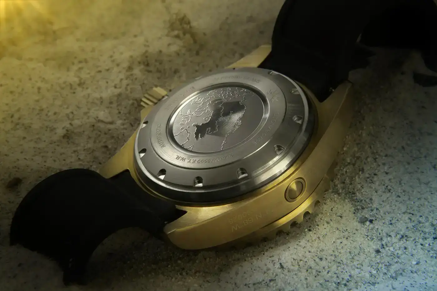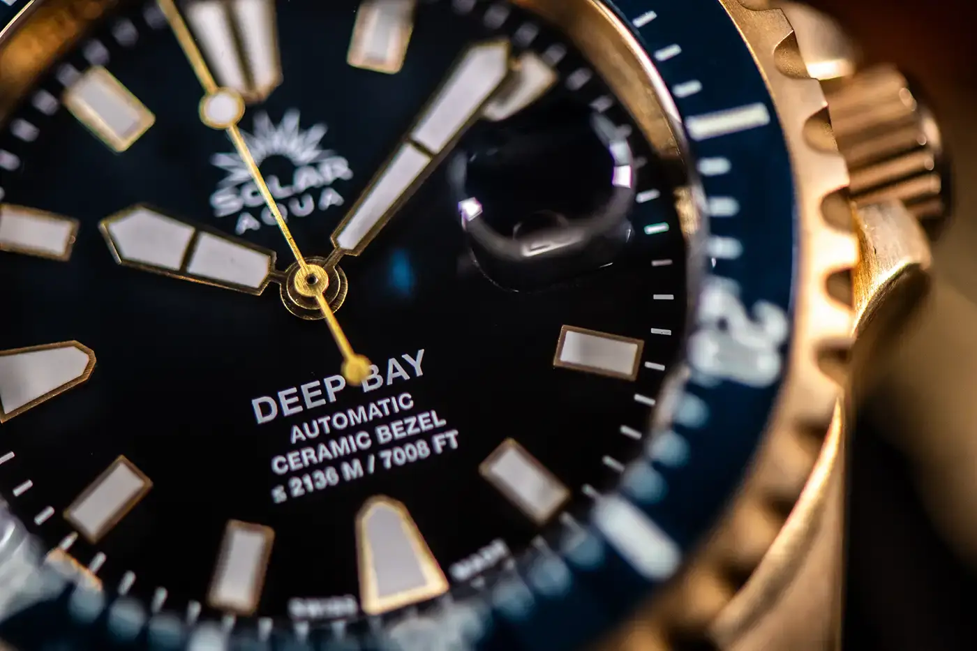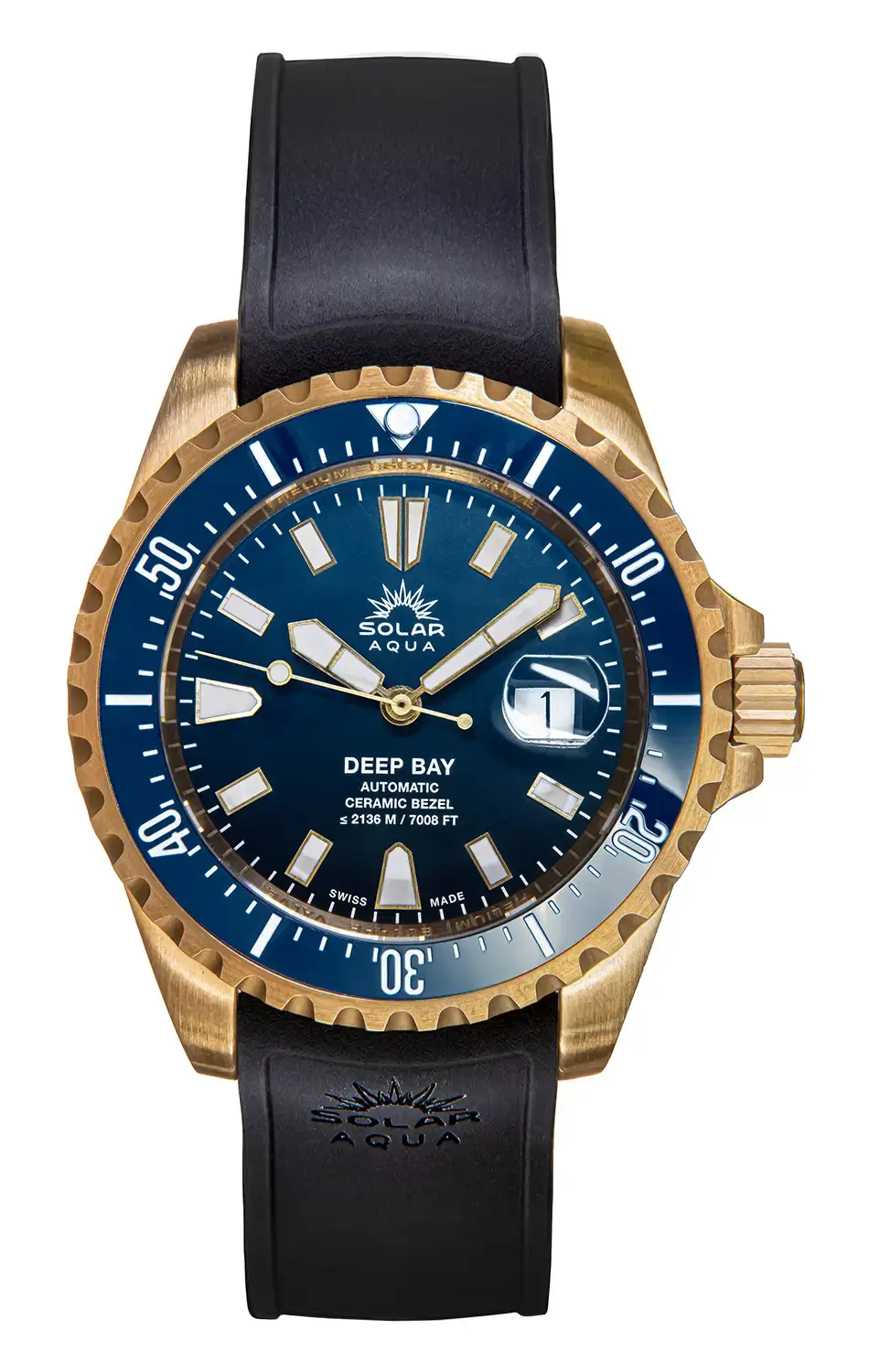 Model Deep Bay Bronze nabízí certifikovanou vodotěsnost až do hloubky 2136 metrů (213,6 ATM). Díky heliovému ventilu umožňuje bezpečné vyrovnání tlaku během dekomprese, což z něj činí jeden z nejpokročilejších potápěčských hodinek na trhu. Srdcem hodinek je přesný automatický strojek Peseux P224, speciálně upravený pro potřeby Solar Aqua. Model Deep Bay Bronze je inspirován drsnou krásou Baffinova zálivu – místo, které odráží nezlomný charakter hodinek. Na boku pouzdra jsou vygravírovány zeměpisné souřadnice (74°N a 68°W) a číslo edice, což podtrhuje exkluzivitu a sběratelskou hodnotu tohoto automatického modelu. Součástí balení je také odolný, voděodolný silikonový řemínek s reliéfním logem značky, který dokonale doplňuje tyto bronzové hodinky.