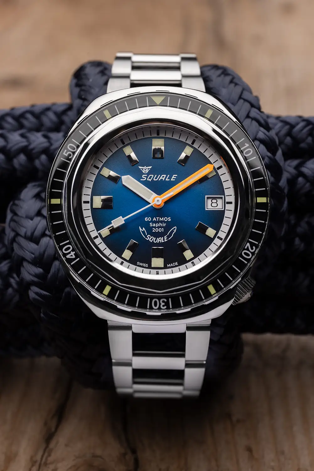 Modrý ciferník typu sunburst s kovovou hloubkou je orámován bílým rehautem s kontrastními minutovými značkami. Leštěné aplikované indexy a ručky jsou vyplněny Super-LumiNova® C3, což zajišťuje skvělou čitelnost ve tmě. Oranžová minutová ručka je klasickým potápěčským prvkem – usnadňuje kontrolu dekompresního času. Na 3. hodině je umístěn datum, a na 6. hodině decentní nápis „Saphir“, odkazující na tradici původního modelu.