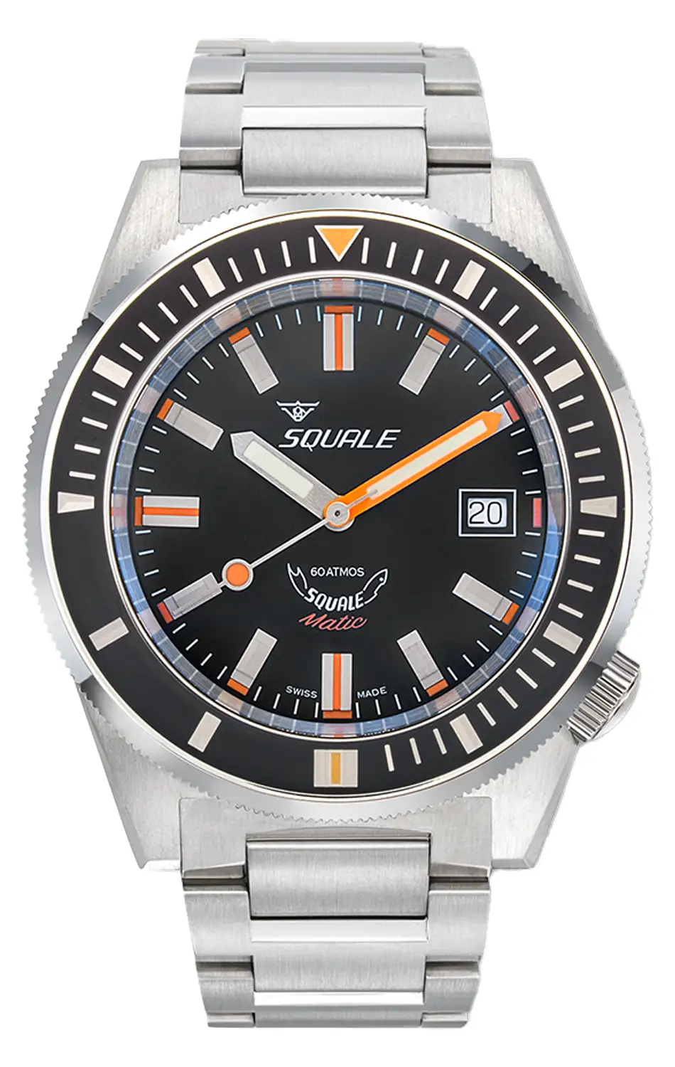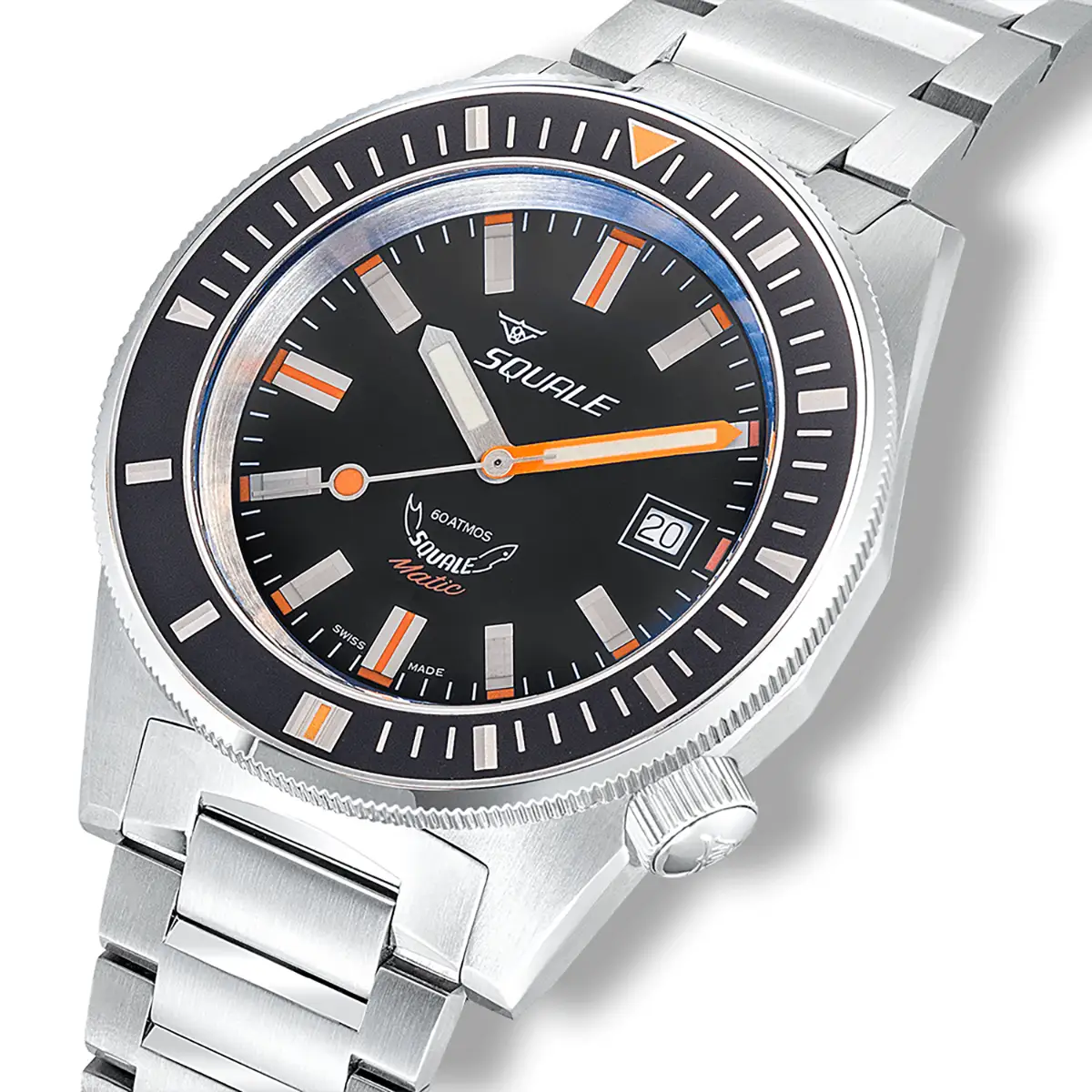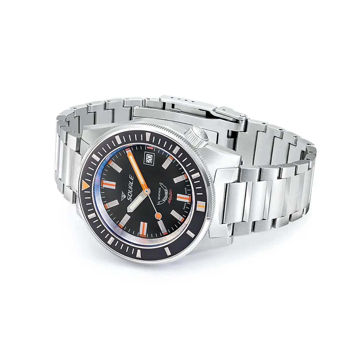 Hodinky Squale Matic MATICXSG.SQ22B jsou profesionální potápěčské hodinky navržené s ohledem na náročné potápěče a znalce technických hodinek. Model se vyznačuje hlubokou černí ciferníku a potápěčské lunety, obohacenou o výrazné oranžové detaily na indexech a nápadnou oranžovou minutovou ručičkou. Takové barevné spojení nejen podtrhuje sportovní charakter hodinek, ale výrazně zvyšuje jejich čitelnost při potápění. Černá potápěčská luneta z ušlechtilé oceli s jasnými značkami umožňuje přesné odečítání doby ponoru i za zhoršených podmínek viditelnosti. Impozantní vodotěsnost do 600 m (60 ATM) podtrhuje profesionální potenciál těchto hodinek.