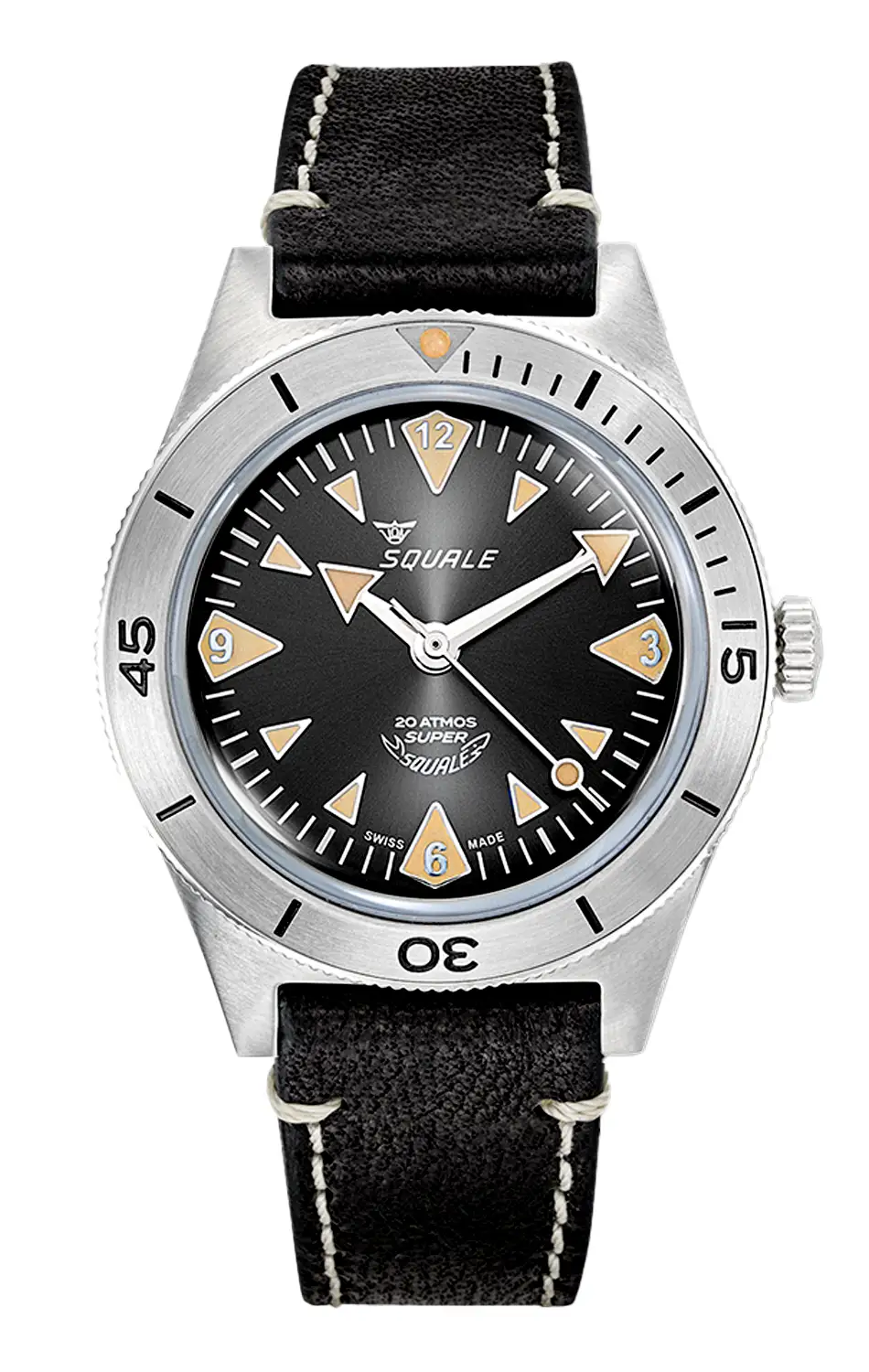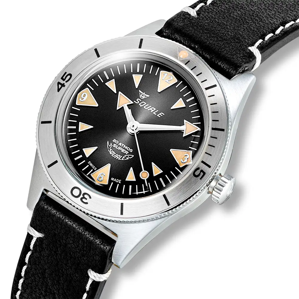 Squale Super Squale Big Arrows SUPERSSBK.PN jsou klasické potápěčské hodinky v moderním provedení, které vzdávají hold modelům ze 60. let a zároveň splňují všechny současné technické standardy. Černý ciferník typu sunray kontrastuje s teplým odstínem indexů pokrytých SuperLuminovou Old Radium a široké ručky typu Big Arrows zajišťují výbornou čitelnost za všech podmínek.