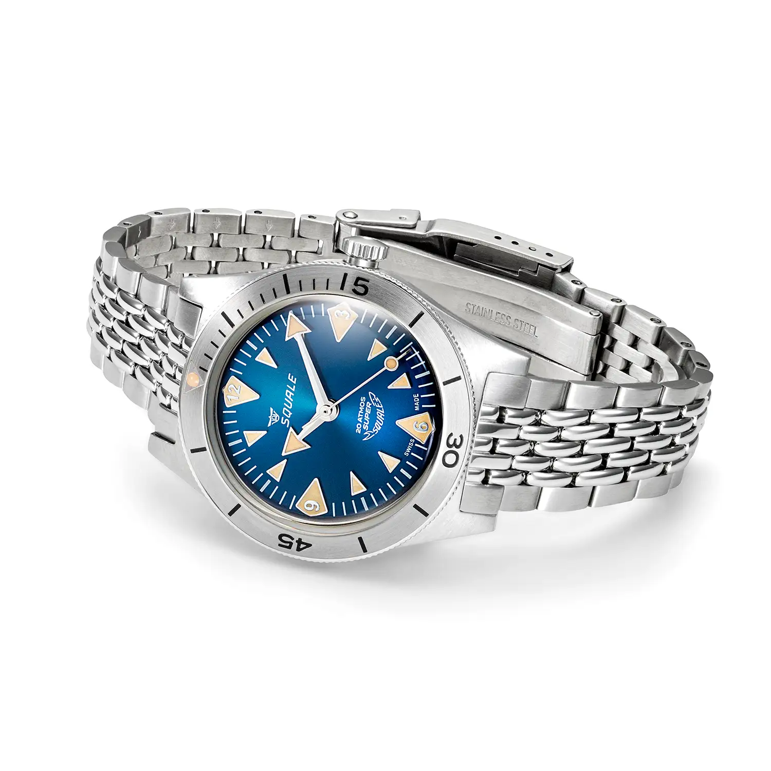 Squale Super Squale Big Arrows SUPERSSABL.AC je moderní interpretací ikonického modelu ze 60. let, která si zachovává charakteristické rysy klasických diverů a zároveň nabízí svěží estetiku a profesionální parametry. Modrý ciferník typu sunray upoutá pozornost hloubkou barvy a indexy i masivní ručky ve tvaru šípů – pokryté SuperLuminovou Old Radium – zajišťují skvělou čitelnost jak nad, tak pod vodou.