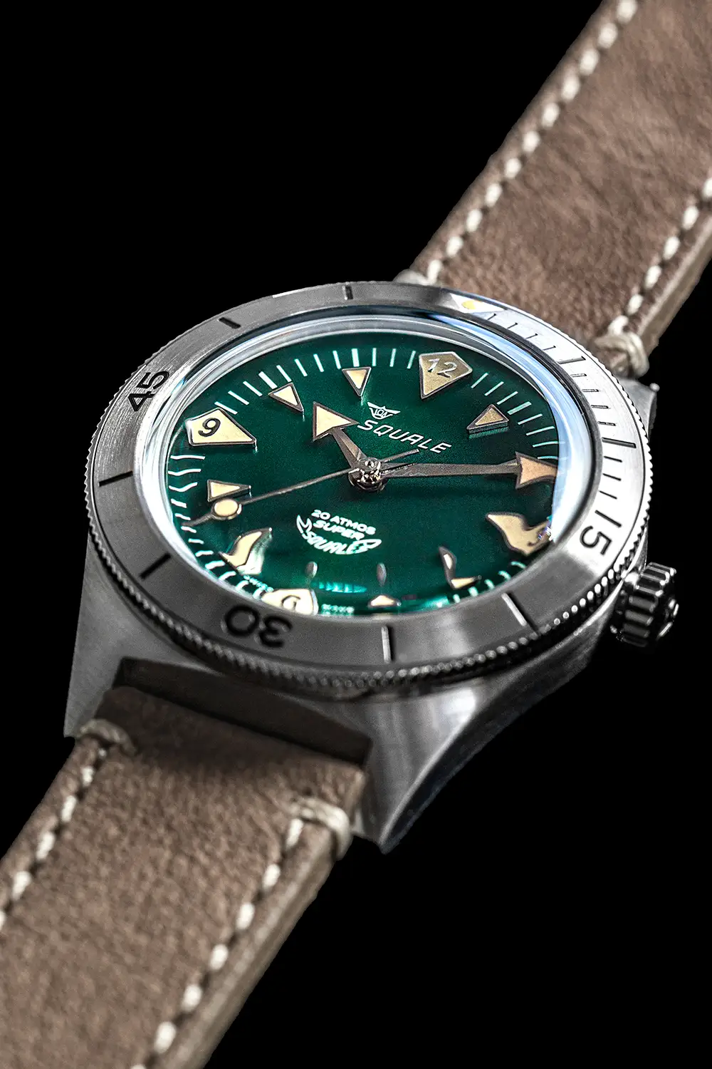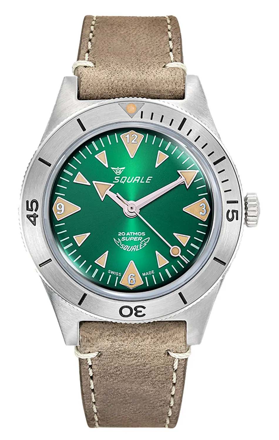 Squale Super Squale Big Arrows SUPERSSAGR.PTO je poctou legendárním potápěčským hodinkám ze 60. let, která spojuje dědictví značky s intenzivní zelení ciferníku inspirovanou mořskými hlubinami. Zelený číselník s efektním sunray povrchem dodává hloubku a charakter, evokující barvy korálových útesů, zatímco výrazné ručky ve tvaru šípových hrotů (Big Arrows) zdůrazňují potápěčský charakter – díky nim je odečet času okamžitý a přesný.