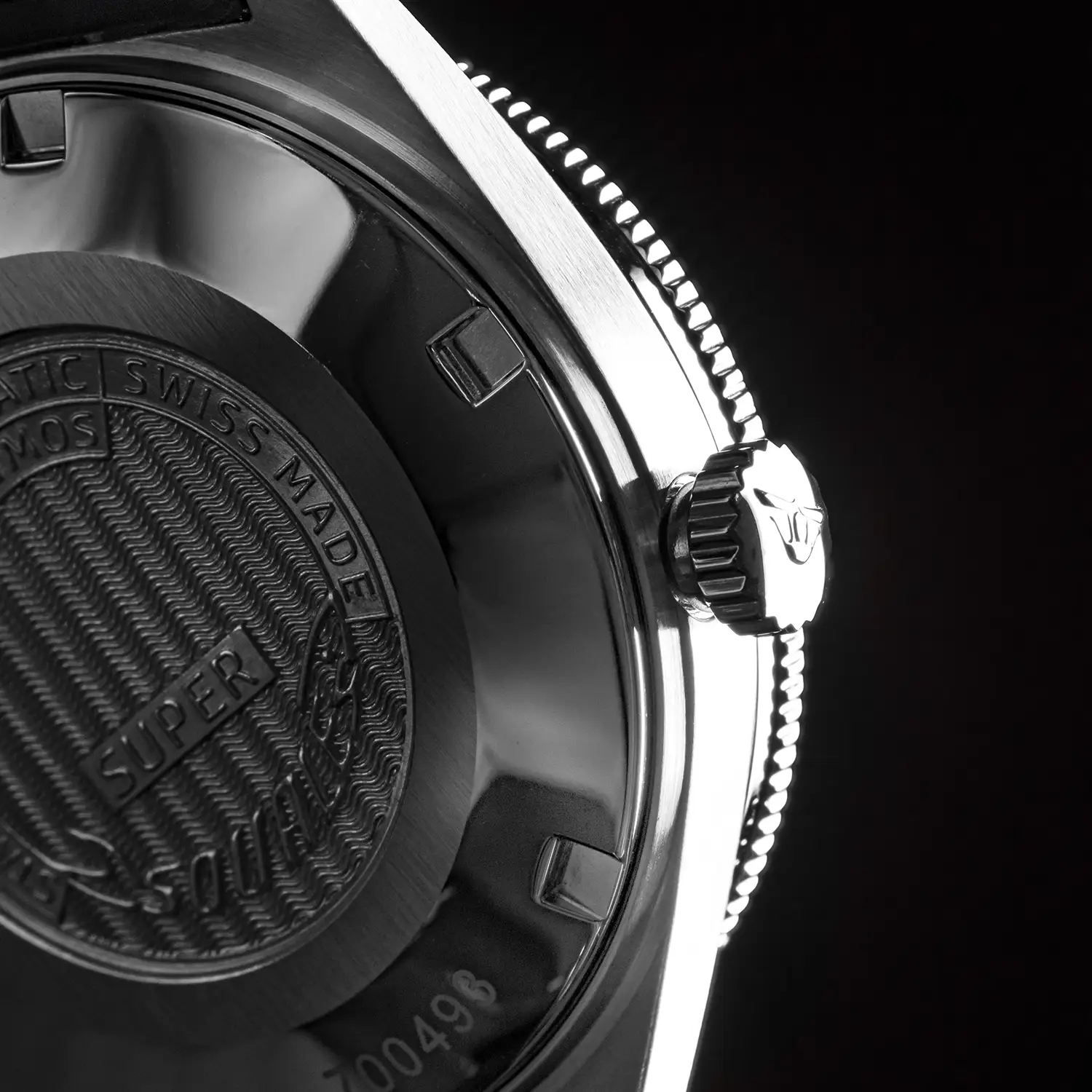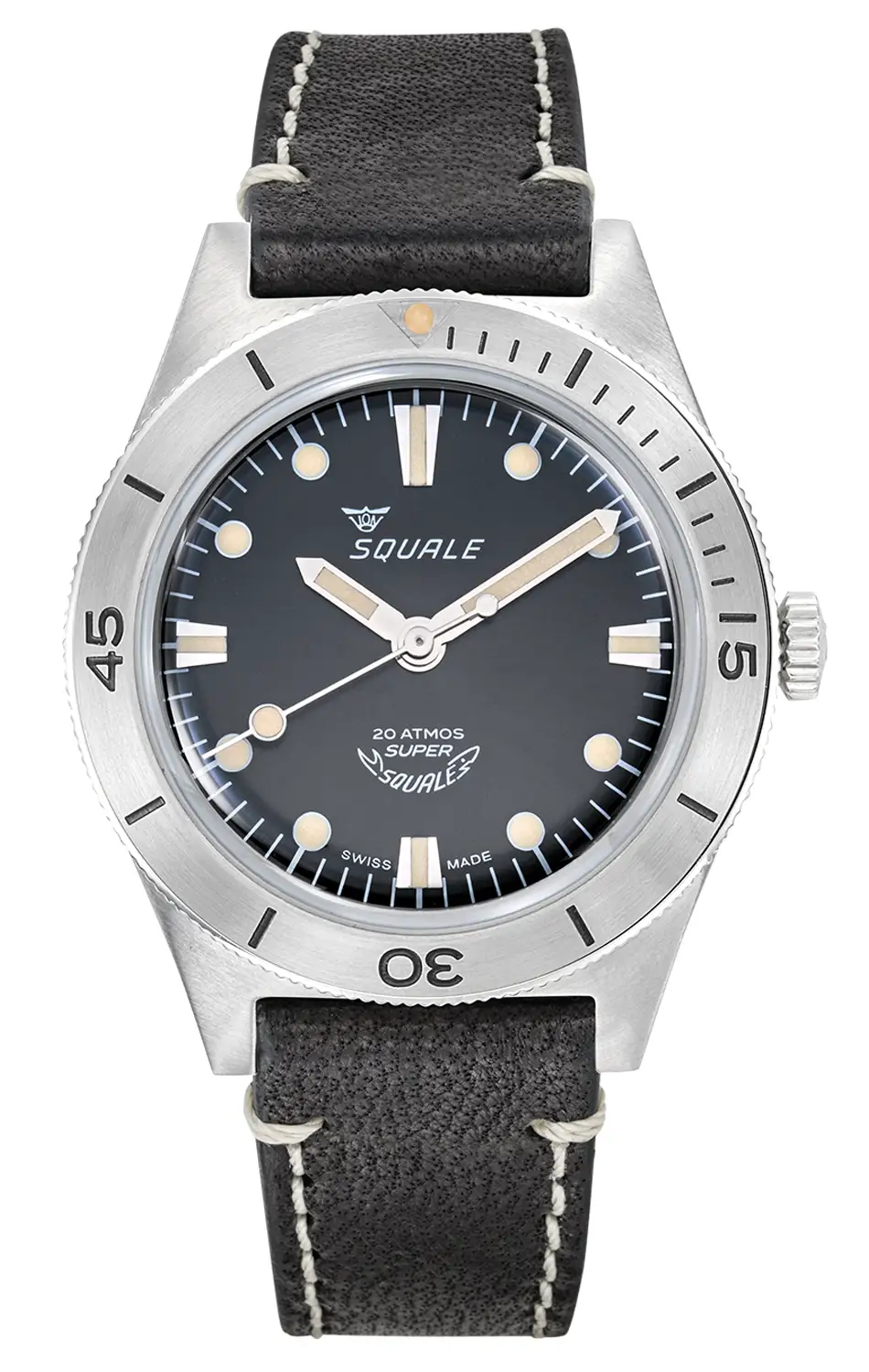 Matný černý ciferník s výraznými tečkovými indexy a jednoduchými ručkami vyplněnými luminiscenční hmotou zaručuje vynikající čitelnost i ve tmě. Vteřinová ručka s kruhovým prvkem SuperLuminova je nejen praktickým detailem, ale i prvkem, který dodává hodinkám osobitý charakter a přesnost. Na ciferníku najdeme ikonické logo Squale ve vintage stylu, odkazující na kořeny značky.