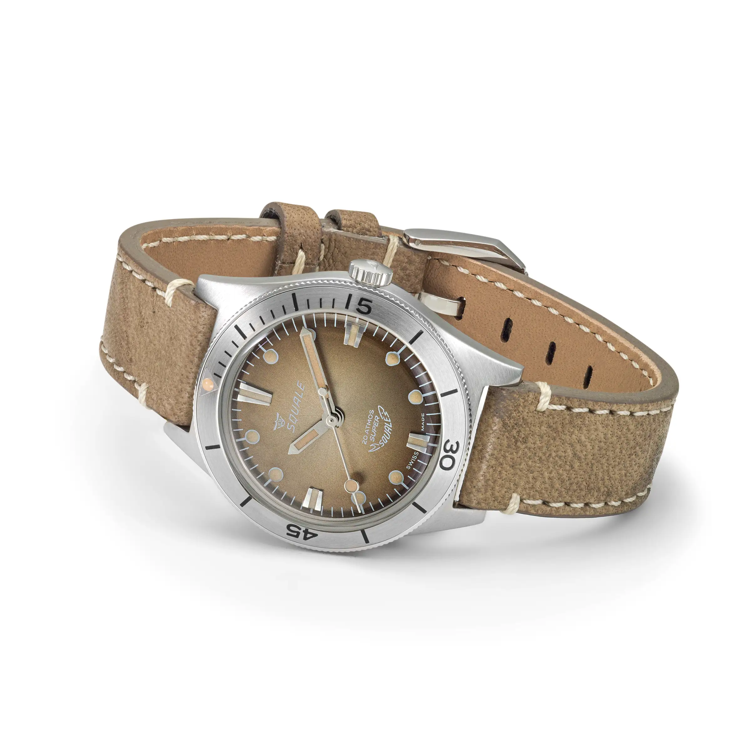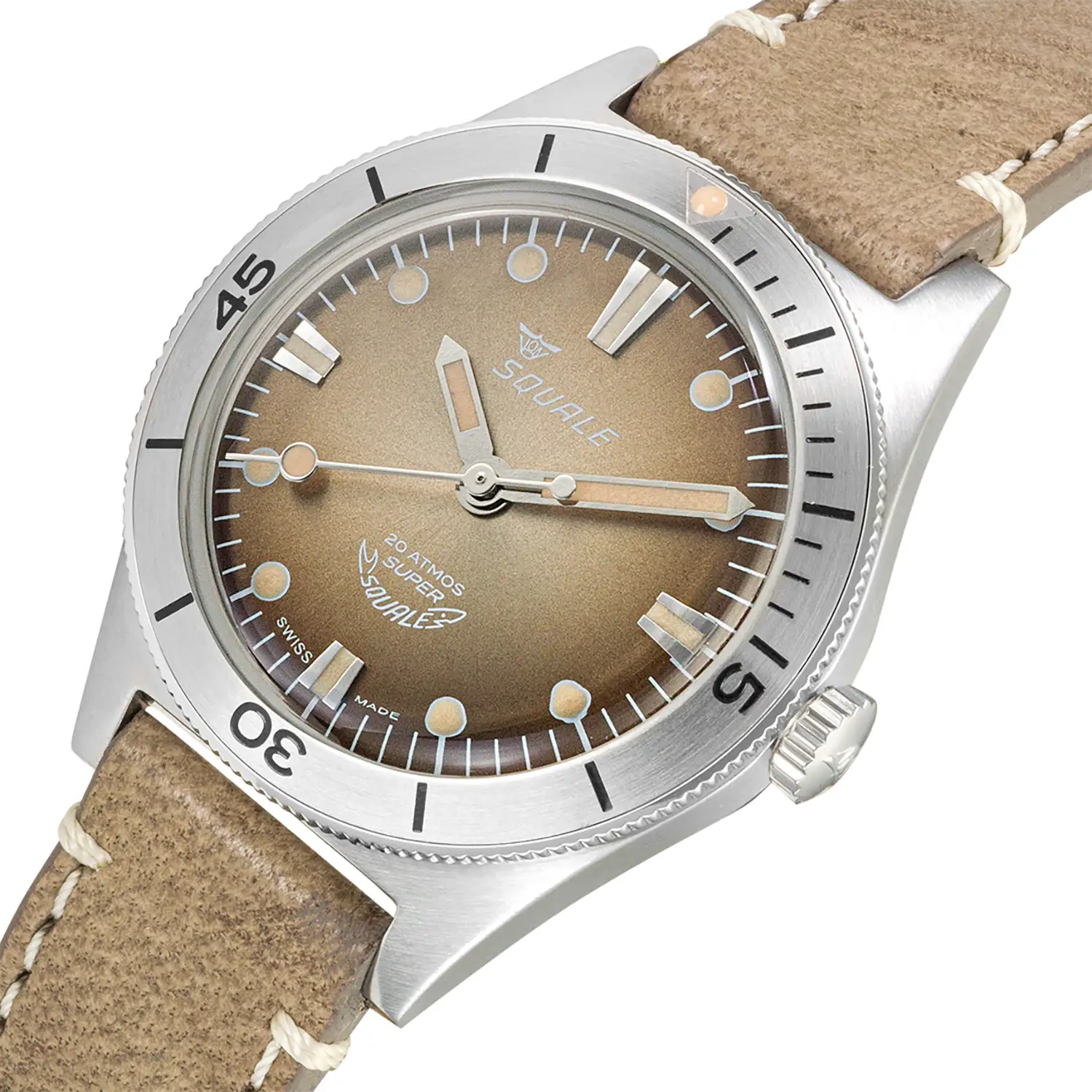 Squale Super Squale SUPERSSBW.PBW jsou stylové potápěčské hodinky v klasickém vintage stylu, které navazují na designy ze 60. let, ale díky moderním materiálům a zpracování skvěle obstojí i v dnešní době. Jejich číselník ve světlém hnědém odstínu (sand brown / warm taupe) se vyznačuje jemným tonálním přechodem, který se mění v závislosti na dopadu světla. Hodinky jsou osazeny hnědým koženým řemínkem s kontrastním prošitím – pohodlným a měkkým na nošení, zároveň stylově ladícím s barvami číselníku.