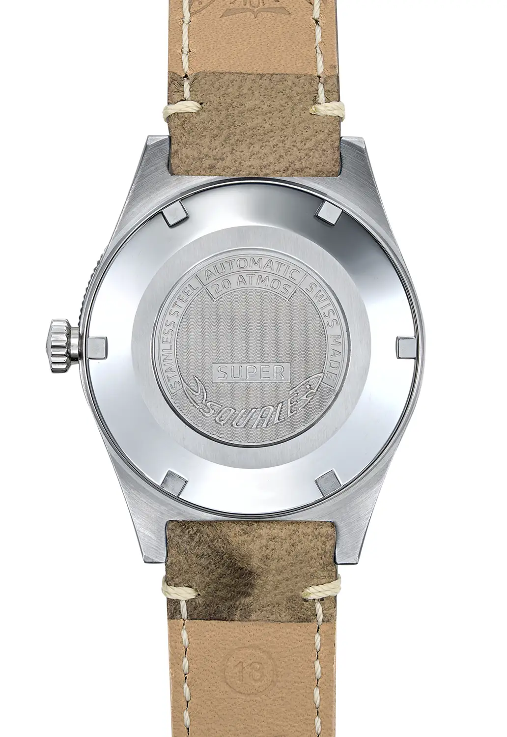Uspořádání číselníku je čisté a minimalistické: absence datumovky podporuje přehlednost, zatímco bodové indexy a jednoduché ručky vyplněné hmotou SuperLuminova zajišťují čitelnost za všech podmínek. Vteřinová ručka se svítícím kroužkem odkazuje na klasické divery a dodává hodinkám osobitý charakter. Číselník zdobí retro logo Squale a nápis „Super Squale“, které podtrhují dědictví této nezávislé švýcarské značky.