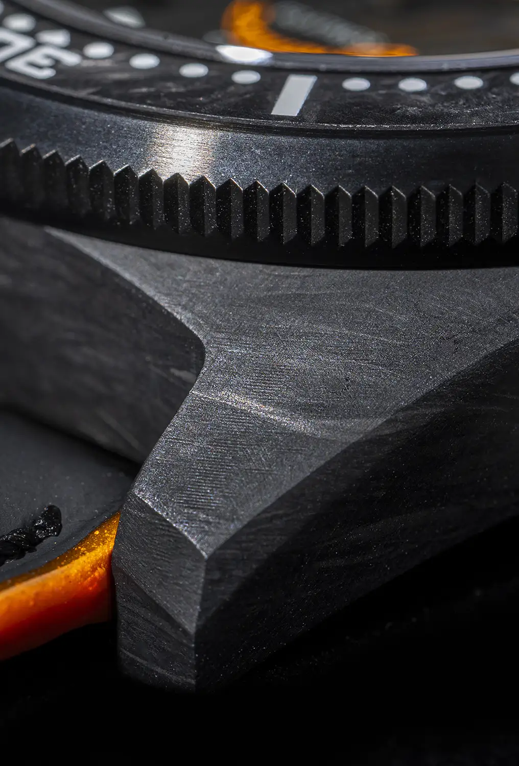 Pouzdro o průměru 42 mm je frézováno z jednoho bloku karbonu a následně usazeno na vnitřní ocelové vložce se šroubovacím dýnkem. Tato kombinace materiálů zaručuje nízkou hmotnost, odolnost proti nárazům a dlouhou životnost při vodotěsnosti do 600 m. Ciferník je rovněž vyroben z karbonu – mramorový efekt je doplněn luminiscencí Super-LumiNova C3 na indexech a minutové ručce, což zajišťuje perfektní čitelnost ve tmě i pod vodou. Datumovka je umístěna na pozici 3. hodiny, a jednosměrná luneta z kovaného karbonu přispívá k ještě vyšší odolnosti a nízké hmotnosti celé konstrukce.