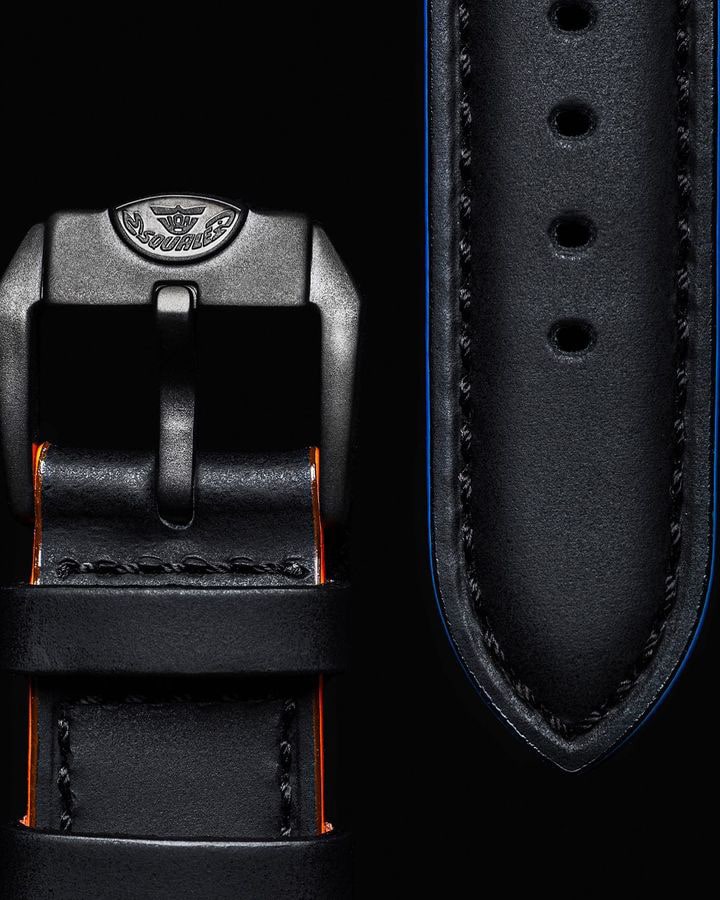 Pro dotvoření jedinečného vzhledu každého T-183 jsou karbonové hodinky Squale dodávány s pogumovaným koženým řemínkem , který odpovídá jejich barevnému schématu.Kůže řemínku je ve skutečnosti potažena gumou