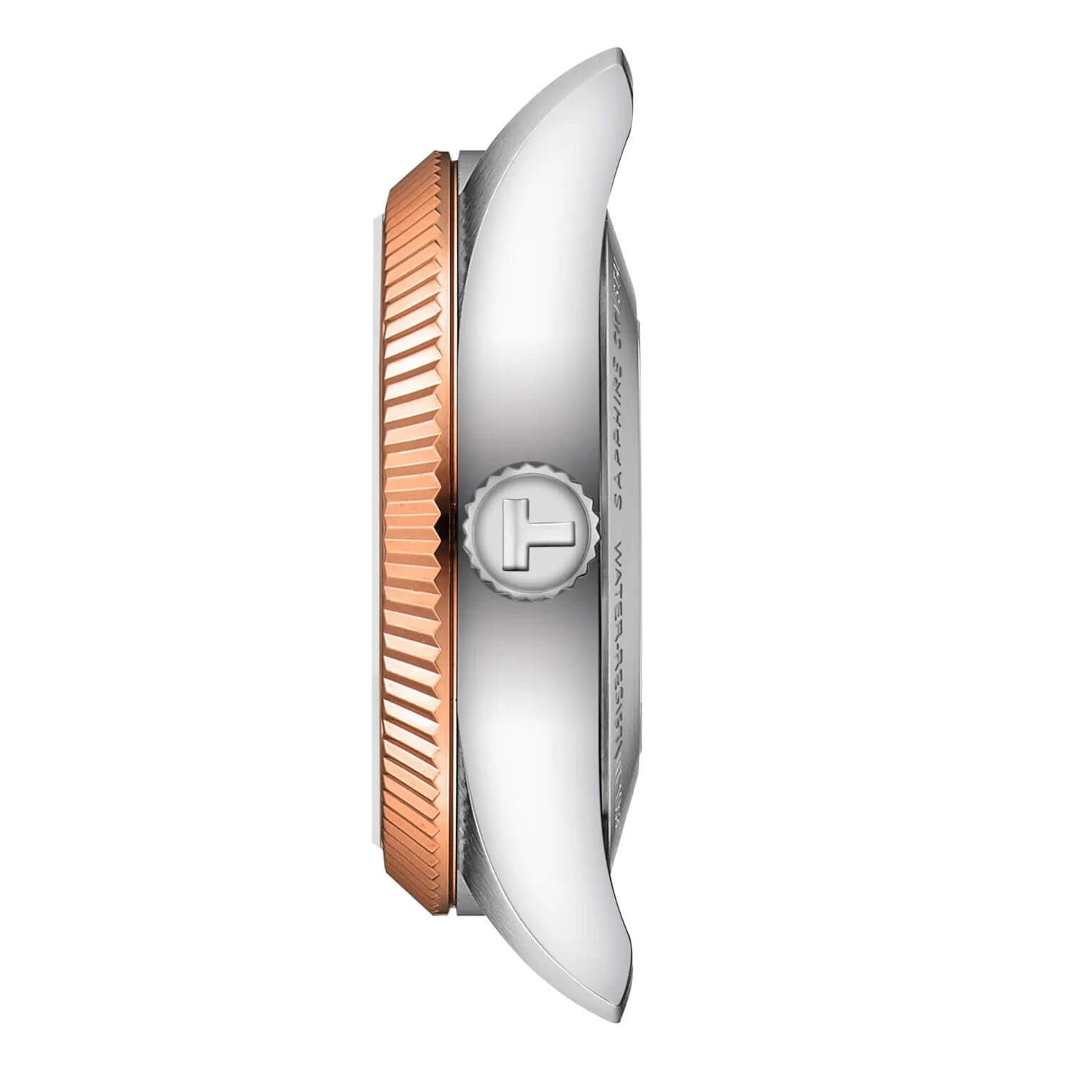 Pouzdro švýcarských hodinek Tissot Ballade Chronometer T156.208.22.033.00 je vyrobeno z ušlechtilé oceli a doplněno elegantním pětiradým náramkem bicolor, který podtrhuje nadčasový charakter modelu. Rýhovaná luneta v barvě zlatého PVD mu dodává výraznost, zatímco odolné safírové sklo s antireflexní vrstvou chrání stříbřitou číselník. Průhledné víko umožňuje obdivovat práci strojku a vodotěsnost do 100 metrů zvyšuje praktičnost v každodenním používání.