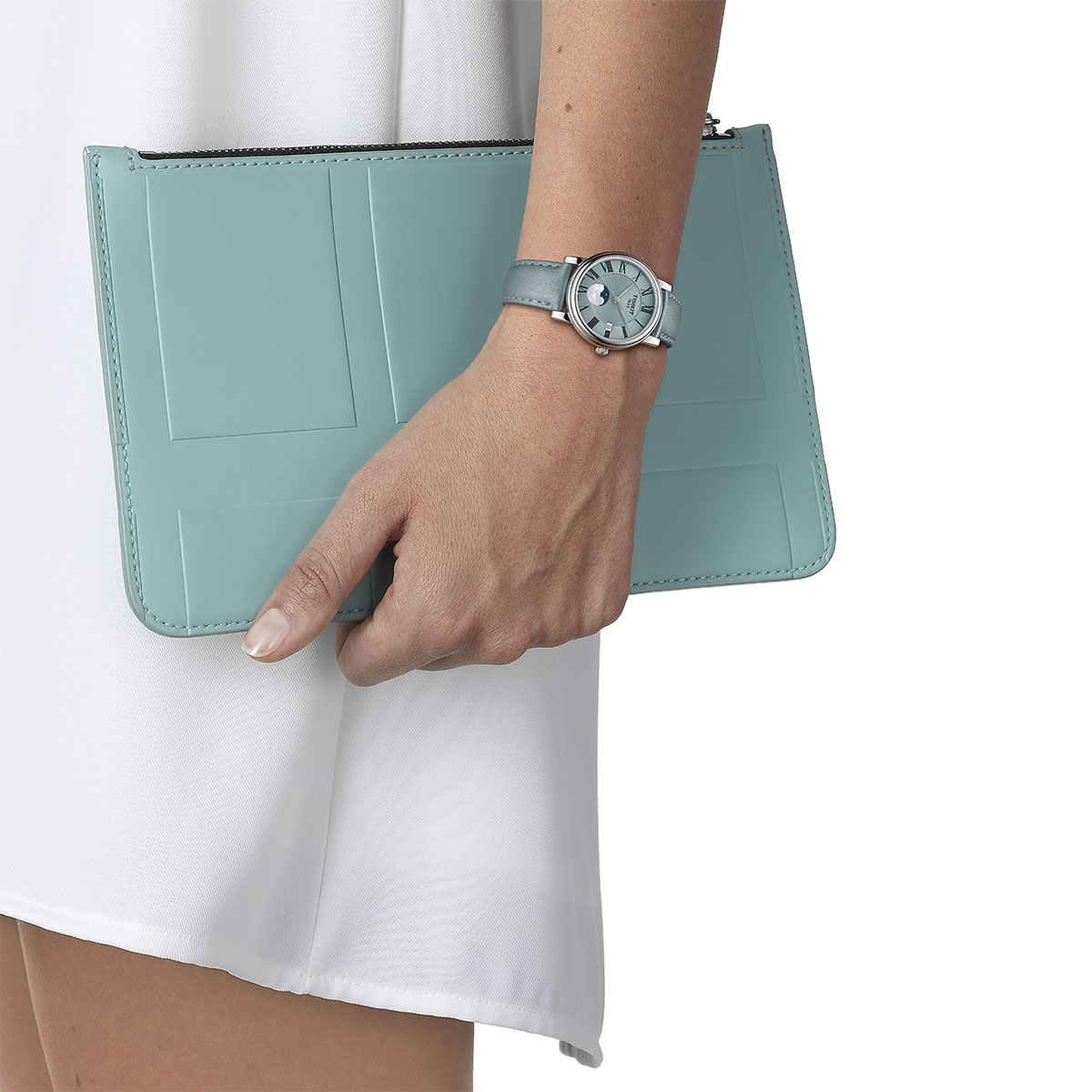 Pouzdro o průměru 32 milimetrů se vyznačuje leštěnou povrchovou úpravou, luneta je úzká a dává tak drtivou většinu prostoru ciferníku. Krajka je jemná a má rýhovaný okraj pro snadnější uchopení. Módní zelenomodrý řemínek je vyroben z ražené pravé kůže. Celý kryt je vyroben z vysoce kvalitní nerezové oceli. Ciferník je krytý nejkvalitnějším safírovým sklem odolným proti poškrábání.