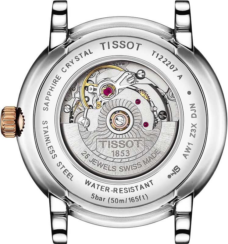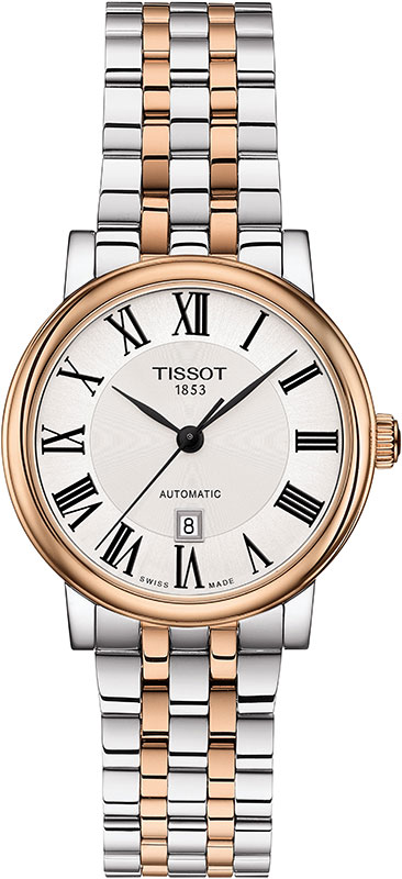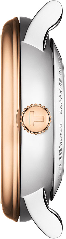 Tissot Carson Premium Lady T122.207.22.033.00 klasické hodinky pro dámy, které hledají elegantní doplněk ke své tvorbě. Krásný čistý ciferník stříbrné barvy s kruhovým vzorem vybíhajícím ze středu. Římské číslice a nabroušené ručičky zajišťují čitelnost. Pouzdro z nerezové oceli s prvky zlacenými PVD růžovým zlatem, o průměru 30 mm, je štíhlé, elegantní a osazené krásným náramkem. Zadní strana pouzdra, která je ze spodní strany glazovaná, zobrazuje zdobený automatický Machineek ETA 2671, který nabízí přesnost Machineku.