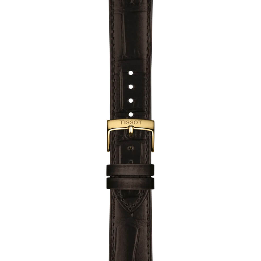 Pouzdro ve zlaté barvě PVD o průměru 40 mm je vyrobeno z ušlechtilé oceli 316L, která zaručuje odolnost proti korozi a dlouhou životnost. Na zápěstí působí hodinky lehce a díky klasické formě mají nadčasové kouzlo, které nepodléhá měnícím se trendům. Řemínek z přírodní kůže s systémem rychlé výměny umožňuje snadné přizpůsobení hodinek vlastnímu stylu – během několika sekund jej lze nahradit ocelovým nebo gumovým páskem značky Tissot. Celek doplňuje odolné safírové sklíčko a ocelové víko, které spolehlivě chrání vnitřní mechanismus.