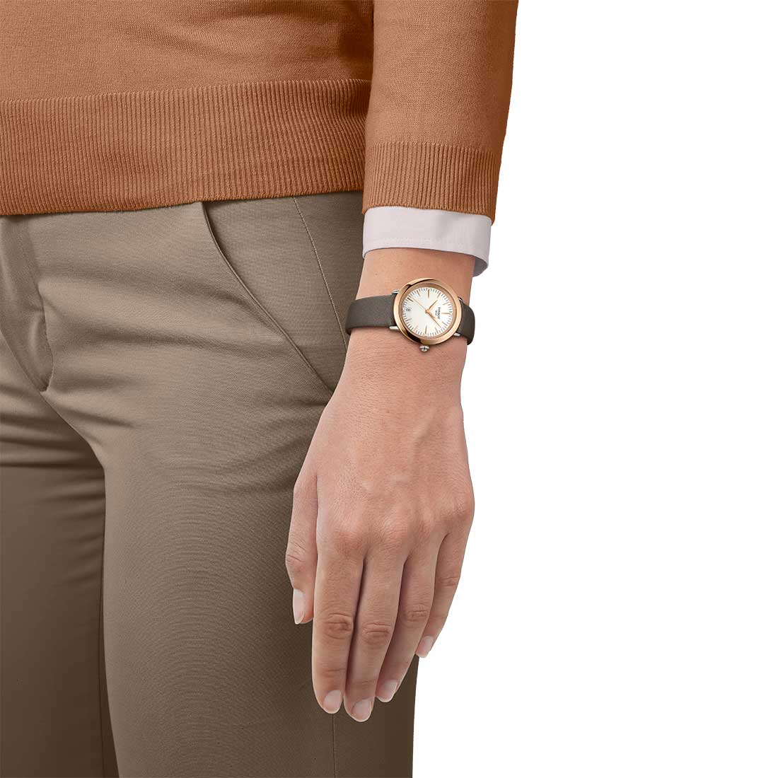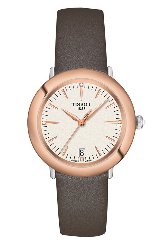 Elegantní dámské hodinky Tissot T929.210.46.266.00 jsou uzavřeny v 33mm pouzdru z nerezové oceli 316L, které je obohaceno o leštěný prsten z růžového zlata. Zlato je jednou z nejžádanějších surovin na Zemi díky své vysoké brilanci, odolnosti proti rozpouštění a rezivění. Díky použitému ušlechtilému materiálu si luneta zachová svůj drahocenný lesklý povrch bez otírání a v případě potřeby může být podrobena procesu leštění. Konvenci doplňuje krajka zdobená kabošonem v podobě pyramidy. Uvnitř se ukrývá spolehlivý švýcarský mechanismus zodpovědný za precizní chod hodinek. Tato kombinace vlastností dělá Tissot Glendora perfektním společníkem pro každodenní i elegantní formální oblečení.