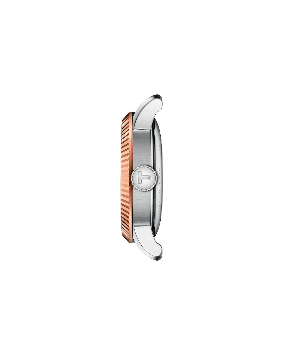 Dámské hodinky Tissot T9322074103600 zaujmou elegantním pouzdrem v kombinaci stříbra a 18karátového růžového zlata, které krásně kontrastuje se stříbrným ciferníkem a propůjčuje modelu luxusní vzhled. Dvoubarevné provedení zdůrazňuje jedinečnost těchto hodinek a vroubkovaná luneta (fluted bezel) dodává klasickou eleganci. Pouzdro o průměru 29 mm je vyrobeno z odolné nerezové oceli, což zaručuje trvanlivost i stylový vzhled. Průhledné zadní víčko umožňuje obdivovat precizní práci automatického mechanismu, což z hodinek činí umělecké dílo hodné obdivu každého znalce hodinářského umění. Hodinky jsou doplněny náramkem z nerezové oceli ve stříbrné barvě, který je elegantní, odolný a pohodlný na nošení. Motýlkové zapínání s bezpečnostní pojistkou poskytuje maximální komfort a chrání hodinky před náhodným rozepnutím.