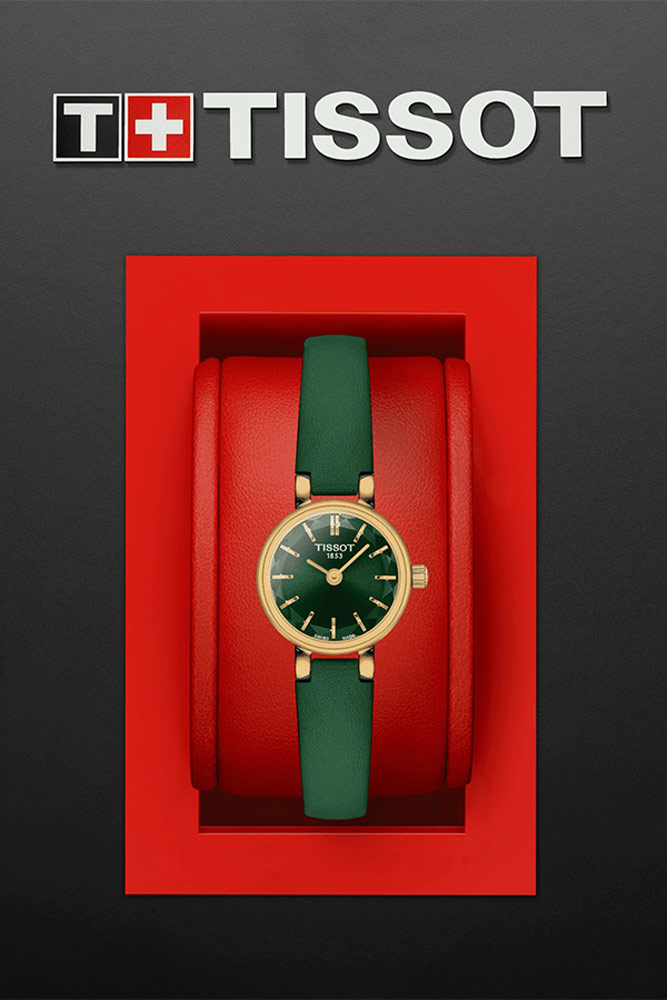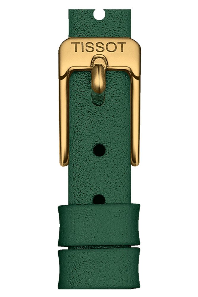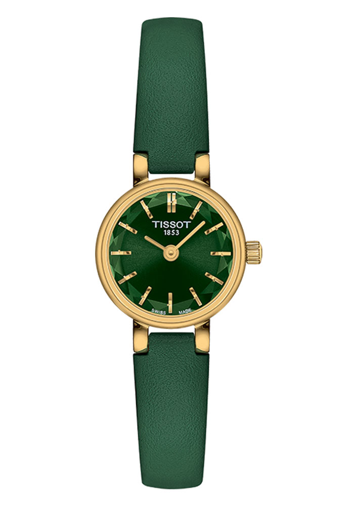 Pozlacené dámské hodinky Tissot Lovely se zeleným ciferníkem a páskem jsou šperkem a mimořádně decentním doplňkem pro ženy, které stejně jako TISSOT oceňují krásu a emoce obsažené v klasických hodinkách. Zejména v těch mechanicky poháněných. Tissot T140.009.36.091.00 zaujme švýcarskou kvalitou i neobvyklými designovými prvky. Přesné fasety na konvexním křišťálově čistém skle fantasticky odrážejí odrazy. Třpytivý, zelený ciferník v kombinaci se safírovým sklem odolným proti poškrábání s takovou povrchovou úpravou vystavuje své kouzla na maximum. Velmi subtilní velikost pouzdra o průměru necelých 20 milimetrů potěší milovníky drobného příslušenství. Tyto elegantní dámské hodinky jsou navíc spárovány s unikátním zeleným koženým řemínkem pro luxusní a originální pár s ocelovým pouzdrem s povrchovou úpravou PVD zlatem.