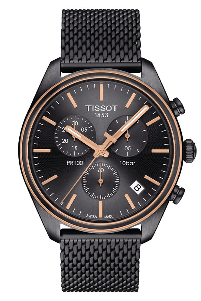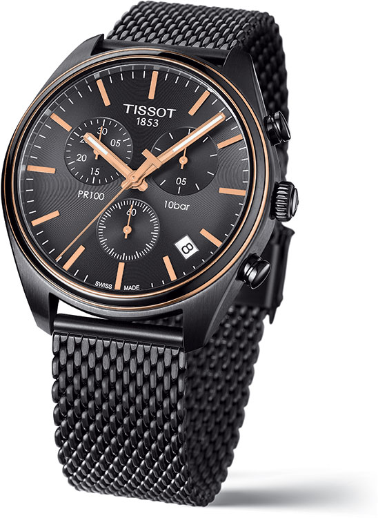 Model s chronografem představuje zcela novou vizi klasických hodinek ve sportovní edici, díky které je můžete nosit jak k elegantním outfitům, tak k džínám. Tissot PR100 jsou klasické hodinky pro lidi, kteří hledají hodinky pro každou příležitost. Zvýšená voděodolnost až do 100m znamená, že ji nemusíte sundávat, ani když se chystáte plavat. Věrný svému názvu je nový Tissot PR 100 přesný a působivý. Stejně jako PR 50 se tato nová řada hodinek jistě stane velkým hitem u mužů a žen po celém světě. Nové modely spojují tradici s módním vzhledem a vysoce kvalitními materiály zvenčí a švýcarskou spolehlivostí uvnitř. Celá řada má moderní design spojený s vysokou voděodolností a novým, velmi odolným náramkem s pohodlným zapínáním na knoflíky a dynamickými ručičkami pokrytými vrstvou luminiscenční hmoty SuperLumiNova .