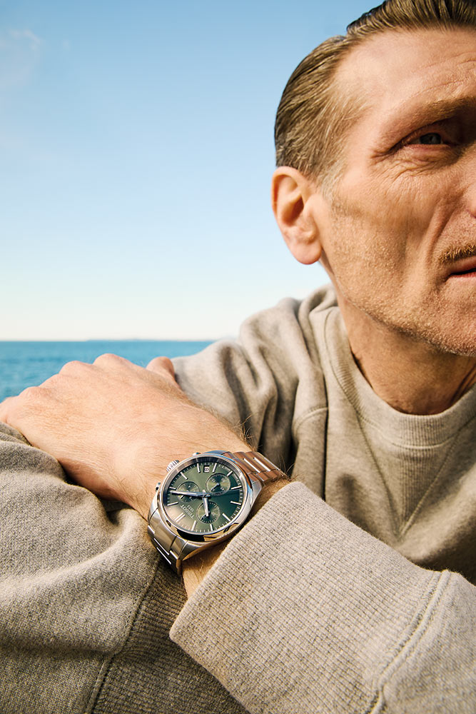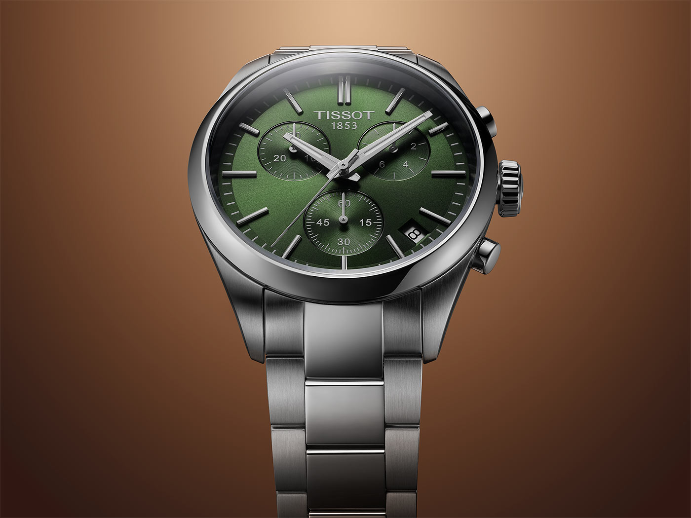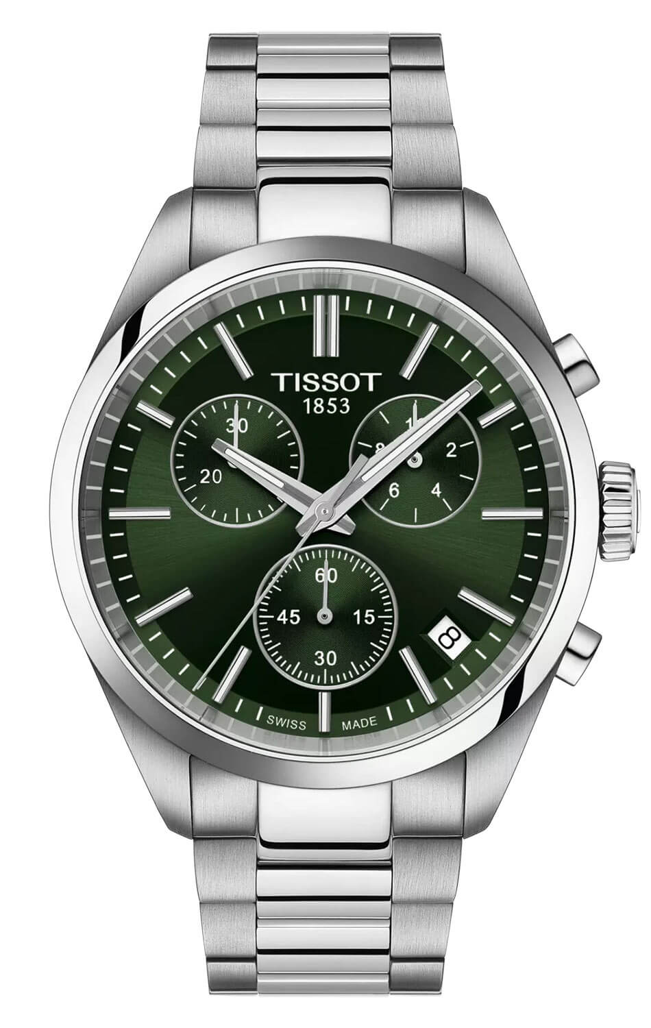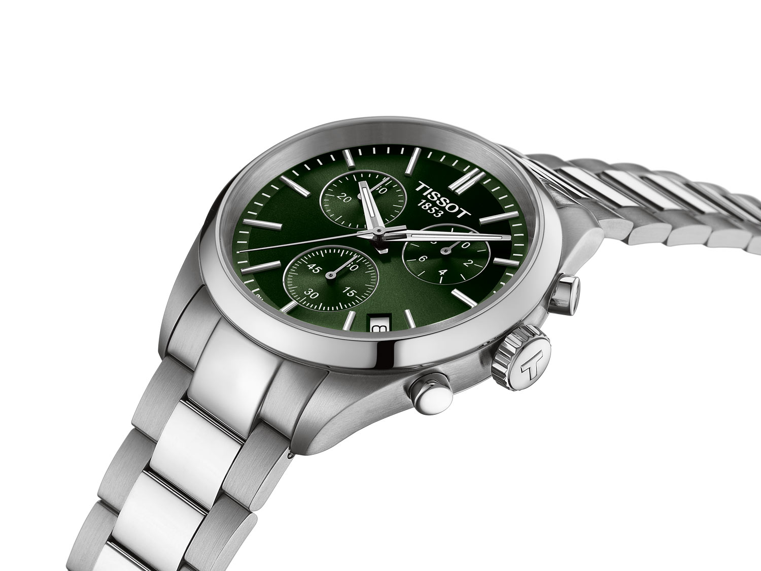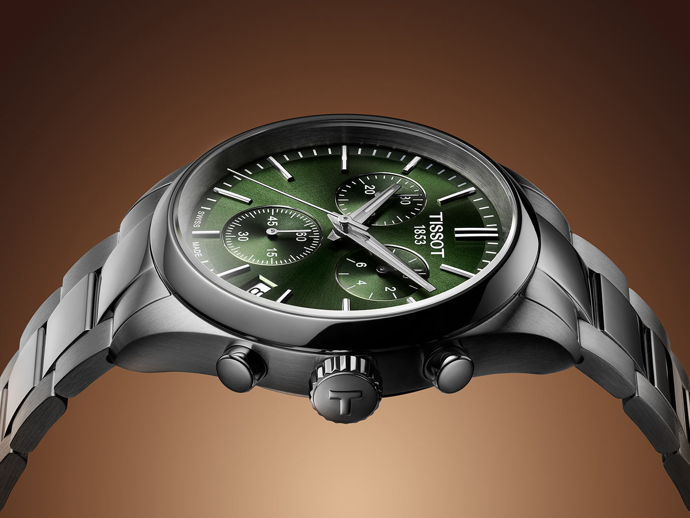 Vysoce kvalitní safírové sklo chrání zepředu funkční ciferník v barvě láhvové zeleně. Jeho čitelnost, i za špatných světelných podmínek, zajišťuje švýcarská luminiscenční vrstva Super-LumiNova® na ručičkách. Na ciferníku jsou tři další ručičky na subcifernících chronografu. Tato funkce umožňuje měřit čas s vysokou přesností. Je to užitečné řešení pro muže, kteří si zakládají na přesnosti měření času, například při sportu. Okno datumovky s jasným pozadím ukazuje aktuální den v měsíci. Hodinky Tissot s náramkem jsou kompletním produktem, který jistě doplní každý mužský šatník. Moderní barevná kombinace umožňuje sladit hodinky s různými styly — od sportovních a každodenních až po ty více oficiální.
