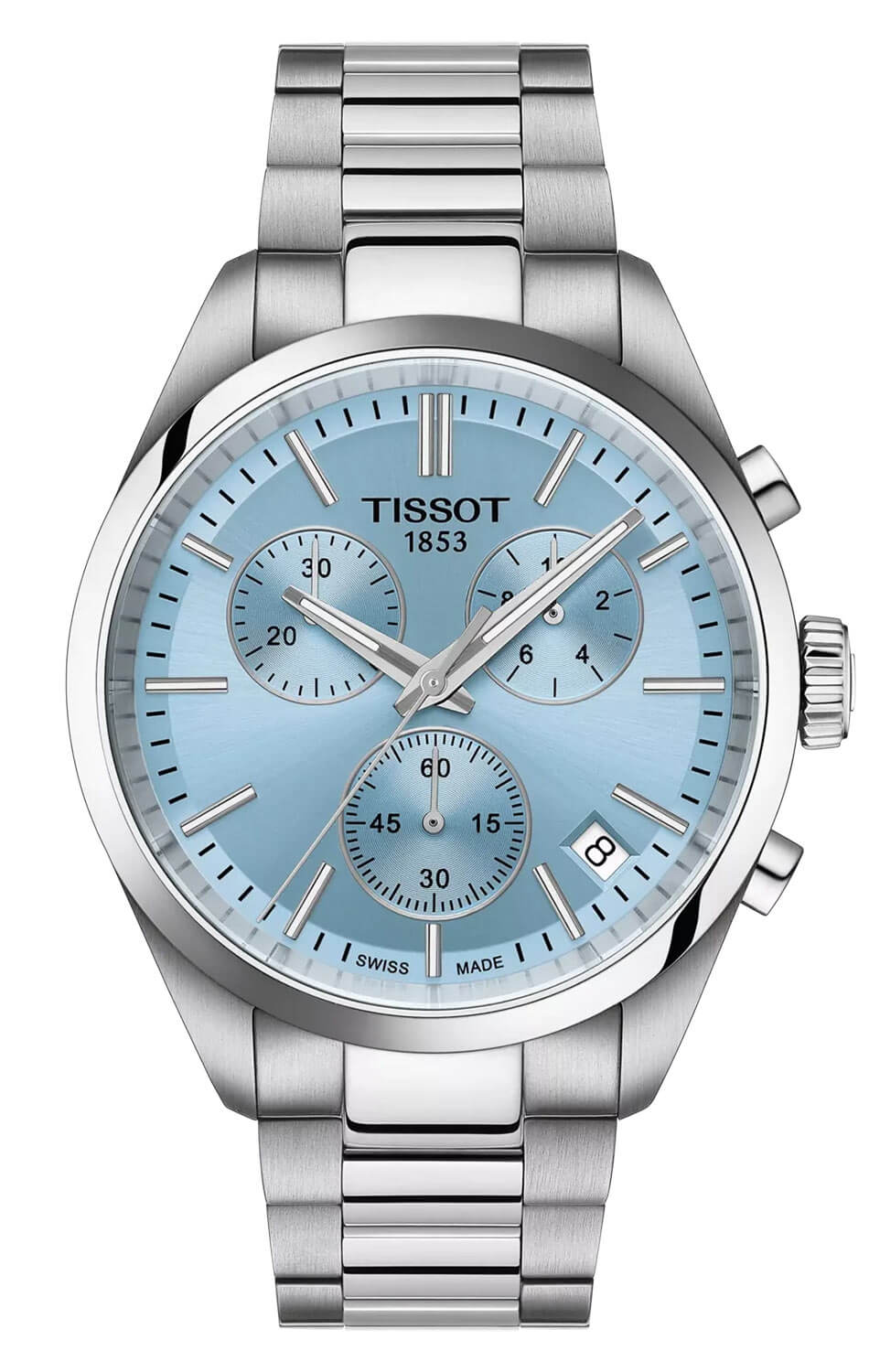 Vysoce kvalitní safírové sklo chrání zepředu funkční světle modrý ciferník. Jeho čitelnost, i za špatných světelných podmínek, zajišťuje švýcarská luminiscenční vrstva Super-LumiNova® na ručičkách. Na ciferníku jsou tři další ručičky na subcifernících chronografu. Tato funkce umožňuje měřit čas s vysokou přesností. Je to užitečné řešení pro muže, kteří si zakládají na přesnosti měření času, například při sportu. Okno datumovky s jasným pozadím ukazuje aktuální den v měsíci. Hodinky Tissot s náramkem jsou kompletním produktem, který jistě doplní každý mužský šatník. Moderní barevná kombinace umožňuje sladit hodinky s různými styly — od sportovních a každodenních až po ty více oficiální.