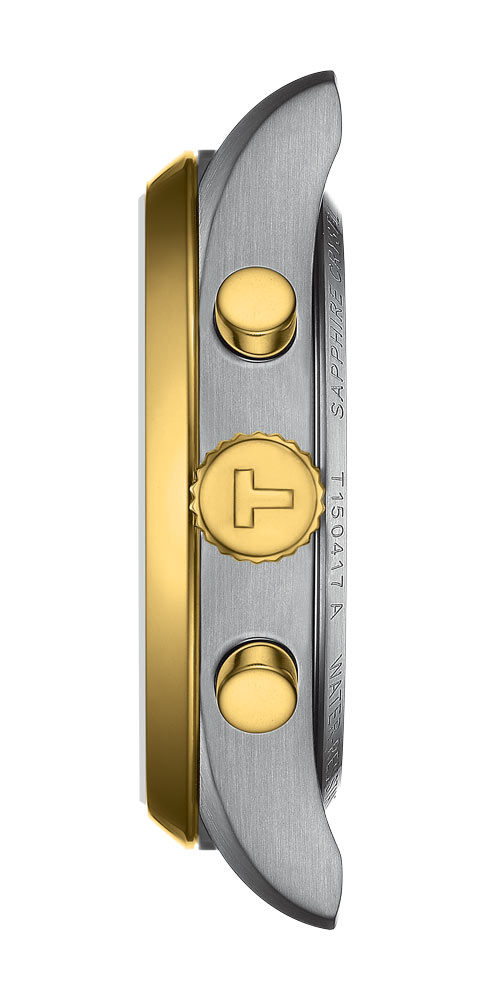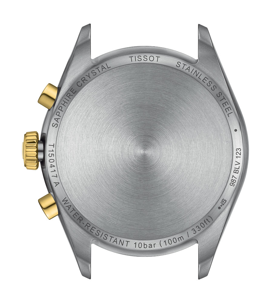 Sportovní a zároveň elegantní časoměřič Tissot PR 100 T1504172203100 zaujme 40mm pouzdrem a ocelovým náramkem, který kombinuje kartáčované a lesklé prvky. Na lunetě, korunce, tlačítkách a středových článcích náramku je povrchová úprava PVD v zlaté barvě. Na pravé straně pouzdra se nachází korunka a tlačítka pro ovládání chronografu. Zadní část tohoto modelu je z nerezové oceli. Hodinky Tissot PR 100 jsou vodotěsné do hloubky 100 metrů. Každý fyzicky aktivní muž může plavat s hodinkami bez obav z jejich poškození — konstrukce je také odolná proti různým druhům koroze. Uvnitř pouzdra je instalován švýcarský křemenný mechanismus G10.212 Chronograph, který zajišťuje přesnost a spolehlivost.