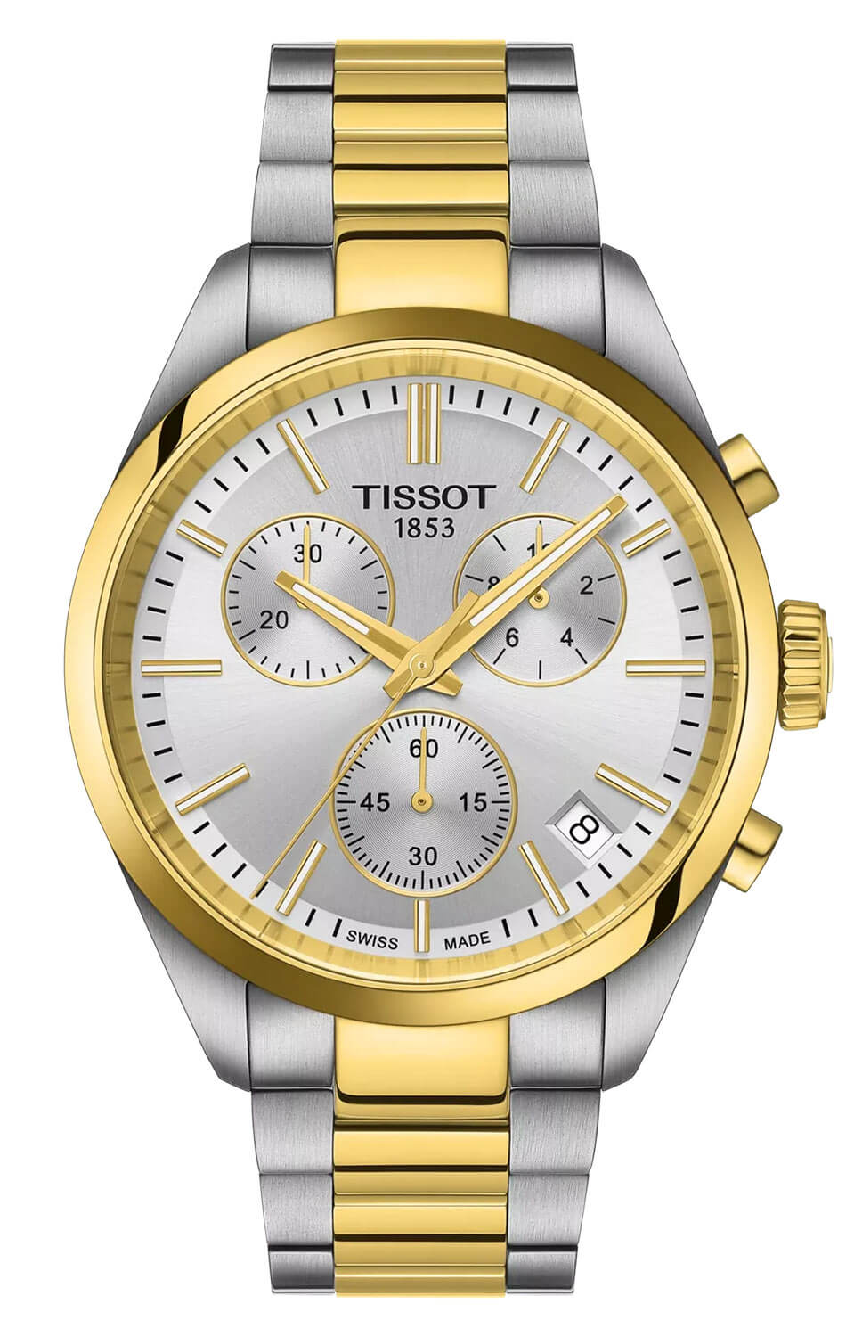 Vysoce kvalitní safírové sklo chrání zepředu funkční stříbrný ciferník. Jeho čitelnost, i za špatných světelných podmínek, zajišťuje švýcarská luminiscenční vrstva Super-LumiNova® na ručičkách. Na ciferníku jsou tři další ručičky na subcifernících chronografu. Tato funkce umožňuje měřit čas s vysokou přesností. Je to užitečné řešení pro muže, kteří si zakládají na přesnosti měření času, například při sportu. Okno datumovky s jasným pozadím ukazuje aktuální den v měsíci. Hodinky Tissot s náramkem jsou kompletním produktem, který jistě doplní každý mužský šatník. Moderní, stříbrno-zlatá barevná kombinace umožňuje sladit hodinky s různými šperky a outfity — od sportovních a každodenních až po ty více oficiální.