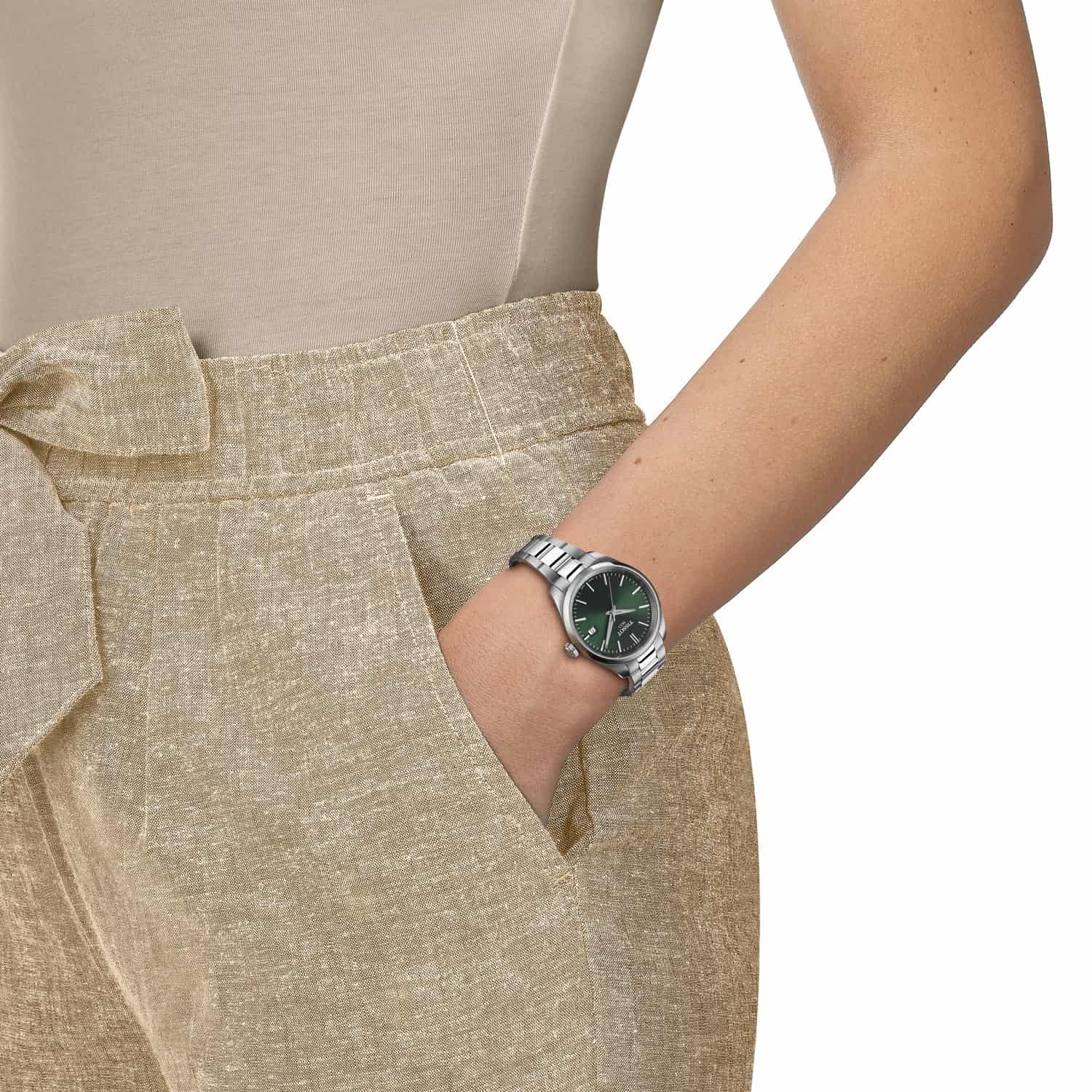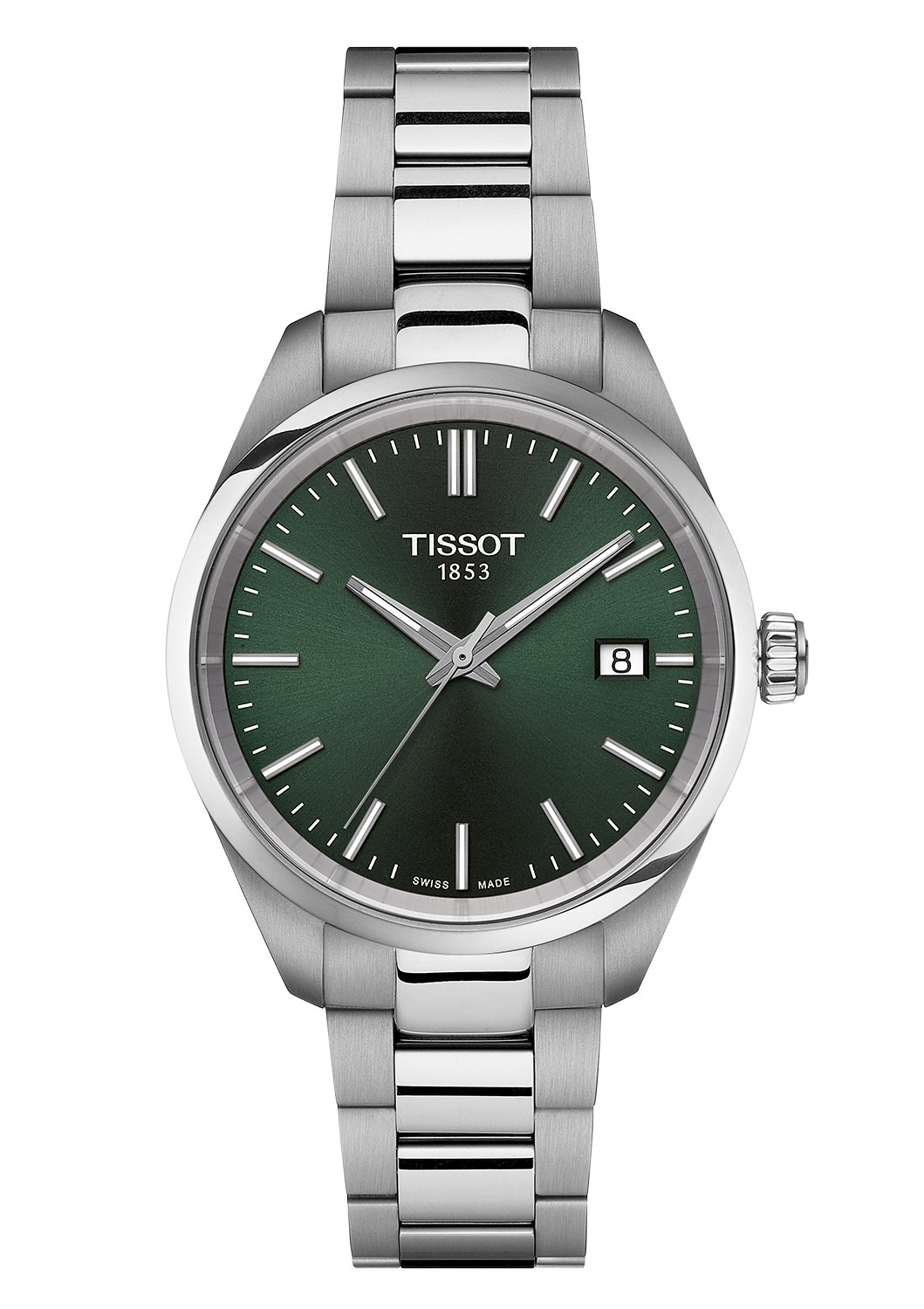 Klasické dámské hodinky Tissot PR 100 jsou zepředu chráněny safírovým sklem. Toto sklo chrání čitelný a minimalistický ciferník v krásné tmavě zelené barvě. Výrobce myslel na fanynky minimalistického designu. Na ciferníku jsou velké ručičky a indexy, které jsou pokryty svítící hmotou Super-Luminova® swiss made, což usnadňuje čtení času za zhoršeného osvětlení. Na třetí hodině se nachází okénko s datem. Design ciferníku umožňuje okamžité přečtení času na první pohled. Pod ciferníkem se nachází švýcarský mechanismus ETA. Tento bateriový strojek je vybaven funkcí End Of Life, která majitelku upozorní na nutnost výměny baterie – sekundová ručička začne přeskočovat indexy každých několik sekund.