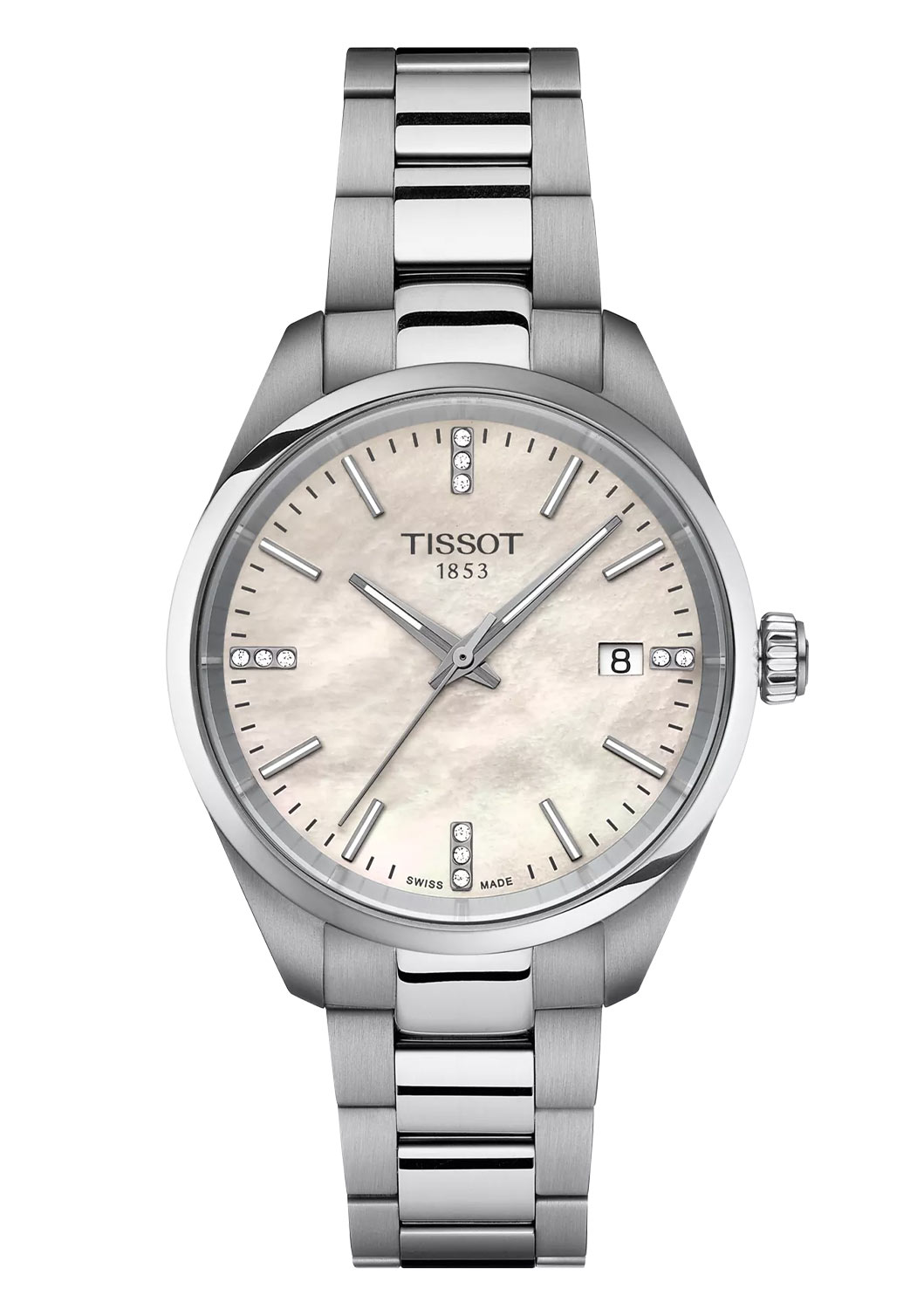 Klasické dámské hodinky Tissot PR 100 jsou zepředu chráněny safírovým sklem, které chrání ciferník obohacený o diamanty a unikátní perleťový vzor. Na ciferníku jsou velké ručičky a indexy, které jsou pokryty svítící hmotou Super-Luminova® swiss made, což umožňuje čtení času i za horšího osvětlení. Na třetí hodině se nachází okénko s aktuálním datem. Design ciferníku umožňuje okamžité přečtení času na první pohled. Pod ciferníkem je instalován švýcarský mechanismus ETA. Tento bateriový strojek je vybaven funkcí End Of Life, která majitelku upozorní na nutnost výměny baterie – sekundová ručička bude přeskakovat indexy každých několik sekund.