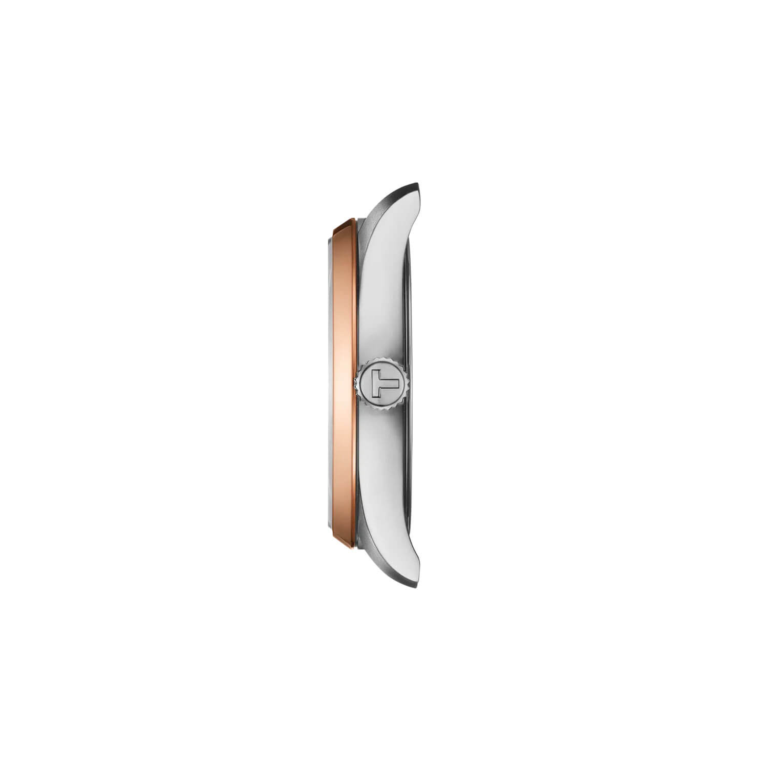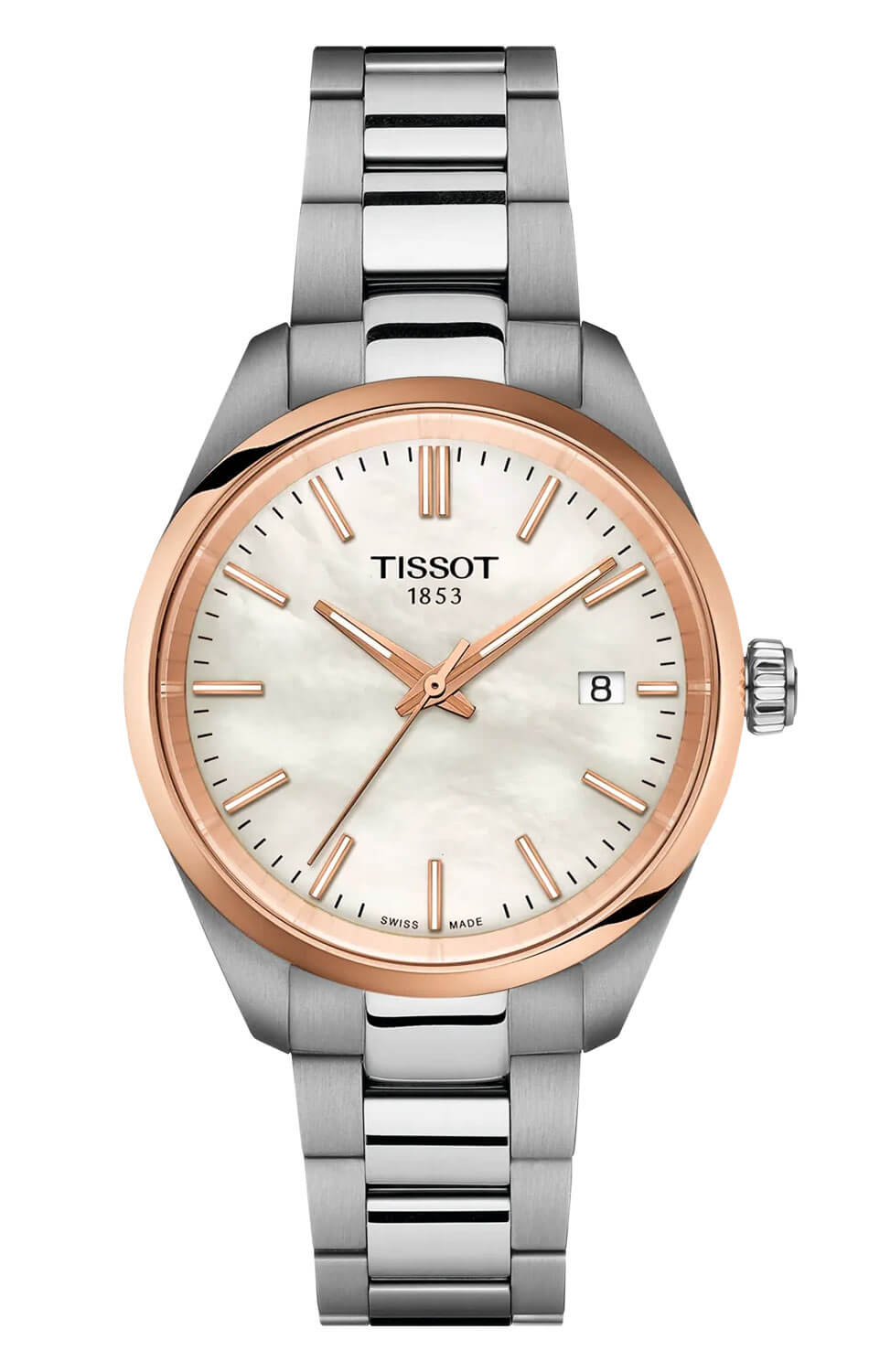 Ciferník z přírodní perleti s jedinečným vzorem dokonale ladí s indexy a ručkami v barvě růžového zlata. Na třetí hodině se nachází datumovka, která přidává na praktičnosti, aniž by narušila elegantní kompozici. Srdcem hodinek je švýcarský quartzový strojek ETA F05.115 s funkcí End Of Life, která upozorňuje na nutnost výměny baterie. Tissot T150.210.21.111.00 s náramkem jsou vytříbené hodinky pro ženy, které očekávají spojení spolehlivé technologie, luxusního vzhledu a univerzálního stylu – plně v souladu s tradicí Swiss Made. Tento model je ideálním doplňkem k lehkým šatům, elegantnímu kostýmu či dokonce sportovnímu outfitu — hodinky jsou barevně moderní, což usnadňuje jejich sladění s různými druhy šperků.