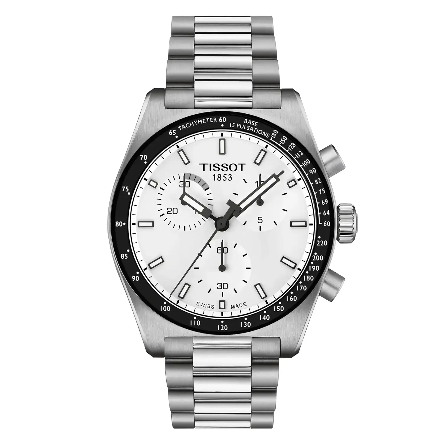 Pánské hodinky Tissot ve vintage stylu. Poháněné švýcarským strojkem ETA Swiss Made s funkcí chronografu. Vybavené minerální lunetou se stupnicí tachymetru a pulsometru. Bílý ciferník chrání safírové sklo odolné proti poškrábání s antireflexní vrstvou. Víko s gravírováním volantu.