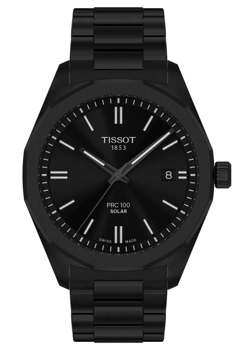 Srdcem hodinek je moderní solární strojek s technologií Lightmaster Solar, která využívá energii ze světla. Místo tradiční baterie byl použit akumulátor dobíjený jak slunečním, tak umělým světlem – stačí každodenní vystavení jakémukoli světelnému zdroji, aby hodinky fungovaly nepřetržitě. Plné nabití mechanismu umožňuje chod hodinek po několik týdnů, a když se úroveň energie blíží vybití, speciální indikátor End Of Energy (E.O.E.) na to upozorní. Tato funkce signalizuje nízký stav nabití například skokovým pohybem sekundové ručky, čímž diskrétně informuje o potřebě doplnění energie světlem. Ciferník modelu Tissot PRC 100 Solar Quartz byl navržen tak, aby efektivně propouštěl světlo k solárním panelům a zároveň uchvátil svým propracovaným vzhledem. Disponuje přehlednými hodinovými indexy a elegantně tvarovanými ručkami pokrytými luminescenční vrstvou Super-LumiNova®, což umožňuje čtení času i ve tmě. Na ciferníku je také praktický ukazatel data, diskrétně zakomponovaný do celkového designu. Kromě toho jsou zde umístěna také logo Tissot a nápis „Solar“, které jemně zdůrazňují přítomnost moderní technologie v klasické formě hodinek.