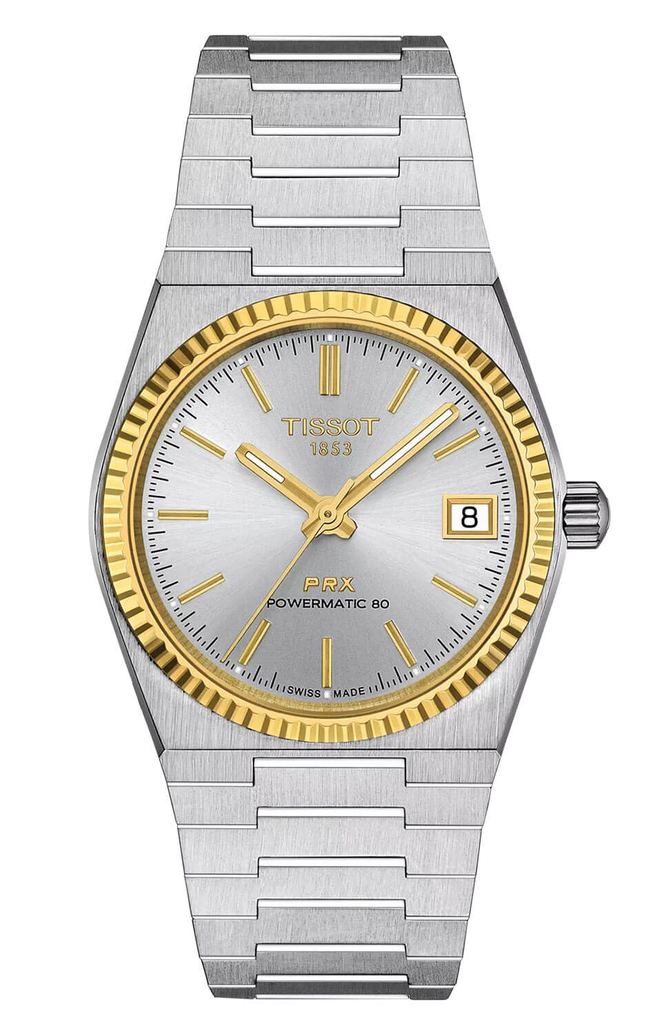 „Innovation by Tradition“ je slavné motto švýcarského výrobce hodinek Tissot, které nejlépe vyjadřuje mistrovský talent značky pro tvorbu designů inspirovaných originály z dřívějších let, odpovídajících současné době. Výše uvedené švýcarské mechanické hodinky Tissot PRX 35 mm 18K Gold jsou model s výše zmíněnou zlatou lunetou, stejně jako jemným plochým pouzdrem ve tvaru tonneau, zlatými ručičkami pokrytými Super-LumiNova a ocelovým náramkem se širokými příčnými články (vhodné pro provedení z konce 20. století). Tělo je kombinací vertikálního kartáčovaného povrchu a šikmého leštění. Systém a konstrukce náramku umožňují dokonalé přilnutí a ergonomické přizpůsobení hodinek jakémukoli typu zápěstí.