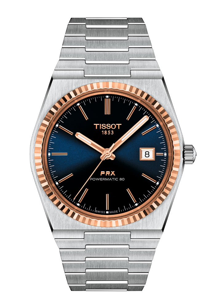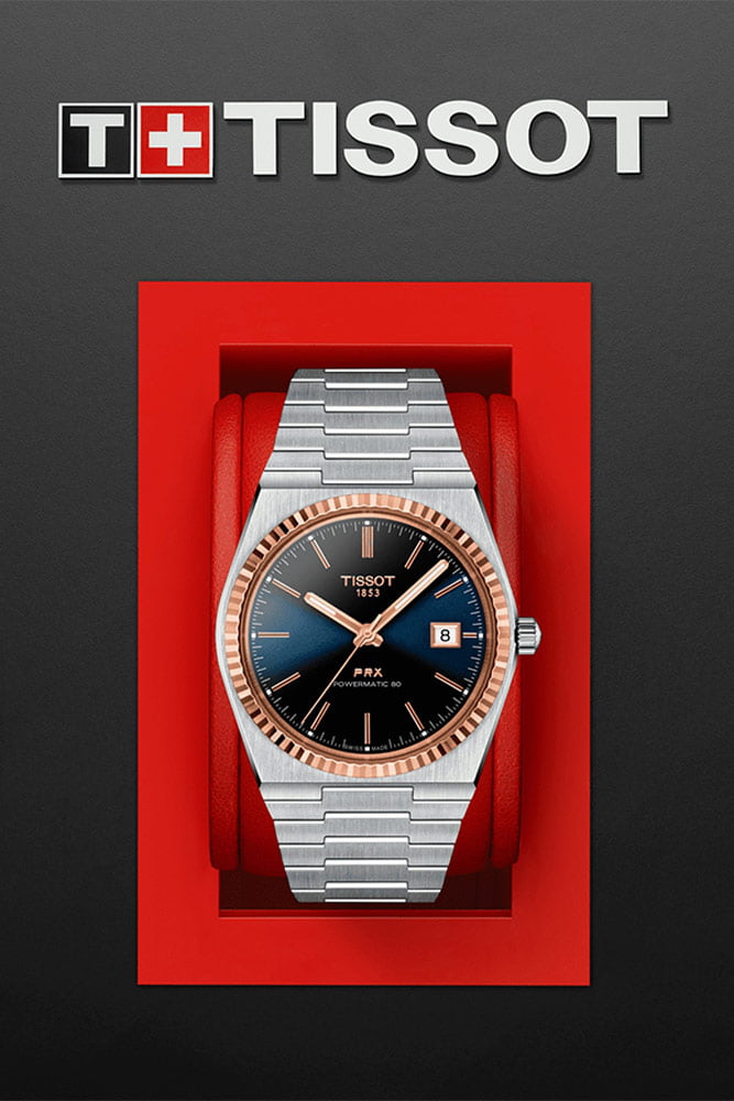 „Innovation by Tradition“ je slavné motto švýcarského výrobce hodinek Tissot, které nejlépe vyjadřuje mistrovský talent značky pro tvorbu designů inspirovaných originály z dřívějších let, relevantních pro současnou dobu. Tissot PRX jsou hodinky s hladkou, tenkou zlatou lunetou, jemným plochým pouzdrem pouzdra, současně štíhlým a vypouklým, pozlacenými indexy pokrytými Super-LumiNova a ocelovým náramkem se širokými křížovými odkazy (typické pro design z konce 70. let .) bez oček, díky čemuž je hladce integrován s pouzdrem. Tělo je maskulinní kombinací vertikálního kartáčovaného povrchu a zkoseného lesku. Systém a konstrukce náramku umožňují dokonalé přilnutí a ergonomické přizpůsobení hodinek jakémukoli typu zápěstí.