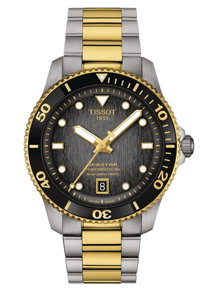 Hodinky Tissot Seastar 1000 Powermatic 80 T1208072205100 nabízejí pevné ocelové pouzdro v univerzální velikosti 40 mm. Vysoká vodotěsnost do 300 metrů umožňuje potápění bez obav o poškození mechanismu. Bezpečnost zajišťuje šroubovací korunka a šroubovací dýnko s průhledem, který umožňuje obdivovat práci mechanismu. Výrobce svůj diverský model doplnil o bicolor náramek, který je vybaven bezpečnou a komfortní motýlovou sponou a systémem rychlé výměny. Stříbrno-zlatý náramek hodinek lze vyměnit bez použití dalších nástrojů.