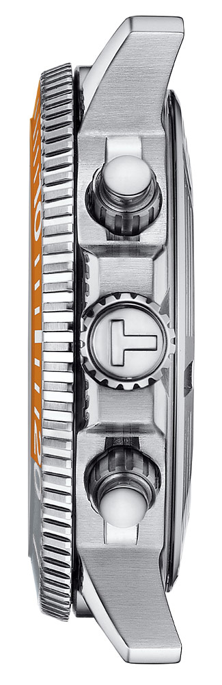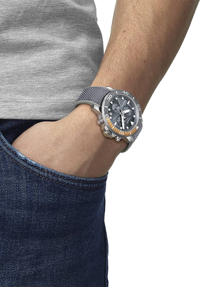 Pod safírovým sklíčkem vysoce odolným proti poškrábání je ciferník s velkými a přehlednými indexy a ručičky s luminiscenční hmotou pro výbornou čitelnost při ponoru. Safírové sklíčko je antireflexní, což usnadňuje čtení informací na číselníku. Ciferník má datumovku a funkci sportovního chronografu, jinak známého jako stopky na speciálně vyhrazených subcifernících. Chronograf se ovládá tlačítky umístěnými na pravé straně pouzdra. Na očka pouzdra je připevněn pohodlný a pružný gumový řemínek s vložkou z šedého materiálu. Tissot Seastar 1000 v módních barvách bude skvělým doplňkem šatníku každého aktivního muže.