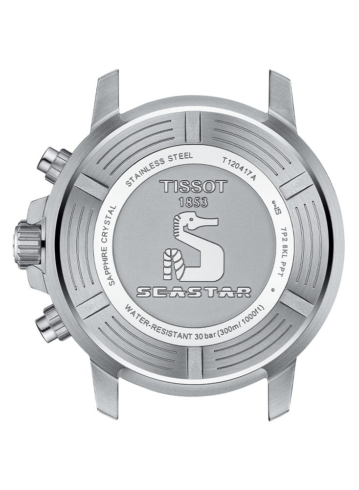 Tissot T1204171708101 je typicky sportovní pouzdro z nerezové oceli ve skutečně pánské velikosti 45,50 mm, které je utěsněno na 300 metrů. Takto vysoká třída těsnosti vám umožňuje potápět se s hodinkami na zápěstí bez obav z poškození jejich mechanismu. Třída těsnosti 30 barů je zachována díky šroubovaným tlačítkům, korunce a víku se symbolem kolekce, tedy mořského koníka. Na přední straně pouzdra je vidět otočná luneta s diverskou stupnicí s dvoubarevným kroužkem. Stupnice na lunetě v kombinaci s minutovou ručičkou, která je pro divere nejdůležitější, vám pomůže sledovat dobu ponoru.