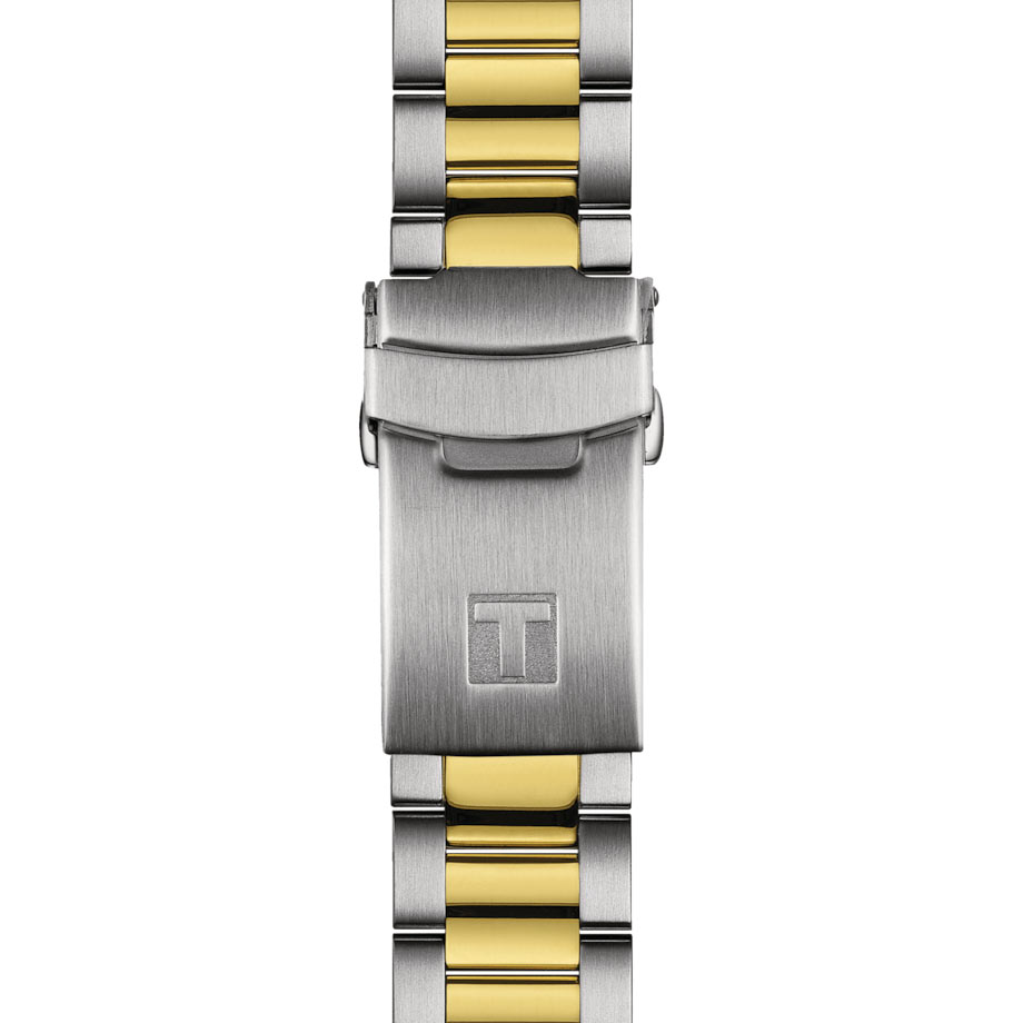Pánské hodinky Tissot T1208522205100 jsou nabízeny v kompaktní velikosti pouzdra 40 mm. Vyznačuje se vysokou třídou těsnosti až do 300 metrů. Tento model může svého majitele doprovázet při plavání a potápění. Design je doplněn šroubovacím krytem z nerezové oceli s vyrytým symbolem značky Tissot, mořským koníkem. Na pravé straně pouzdra je na svém tradičním místě šroubovací korunka. Jde o další důležitý prvek, který hodinky chrání proti vodě. Hodinky jsou spárovány s dvoubarevným ocelovým náramkem, který má bezpečnou motýlkovou sponu se dvěma knoflíky a sponou. Stříbrno-zlatý náramek pohodlně a bezpečně padne na mužské zápěstí. Může být nahrazen koženým, gumovým páskem nebo jiným náramkem díky systému rychlé výměny, který nevyžaduje další nástroje.