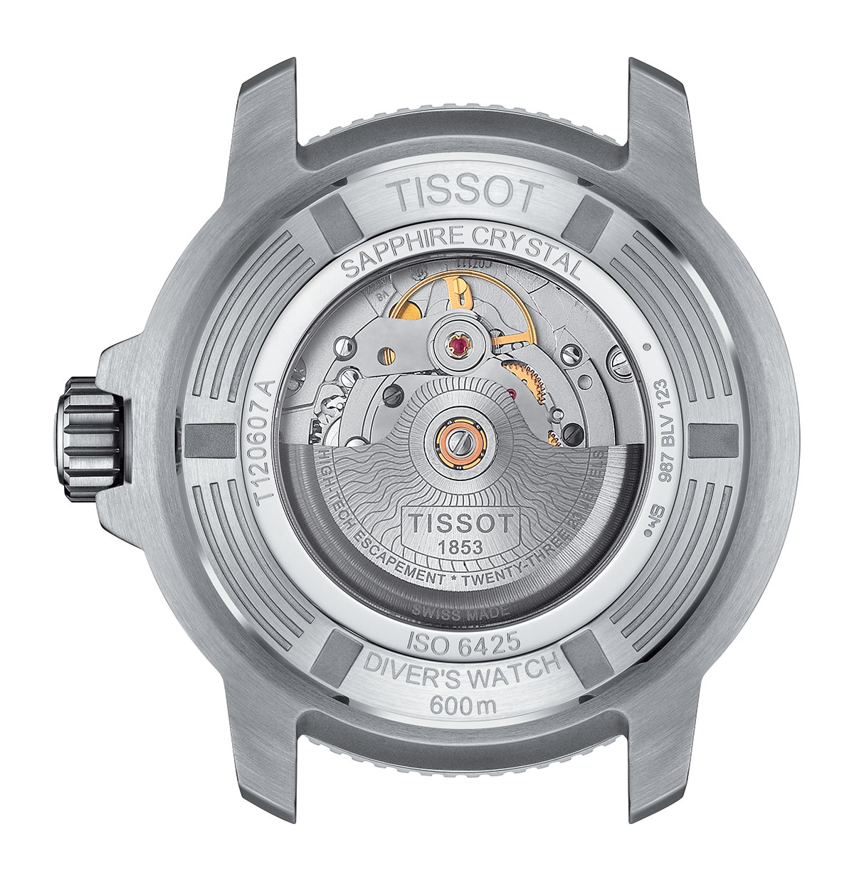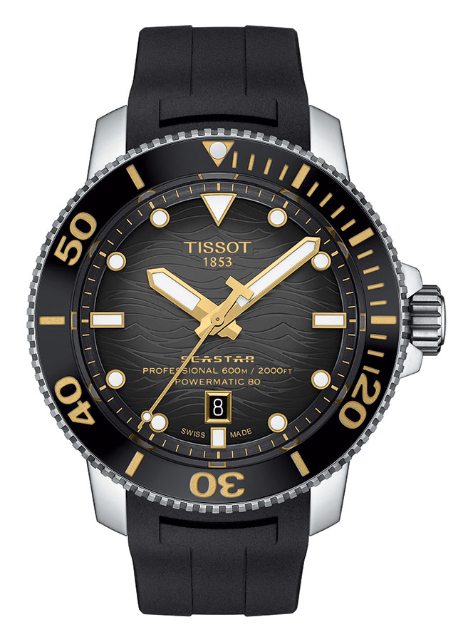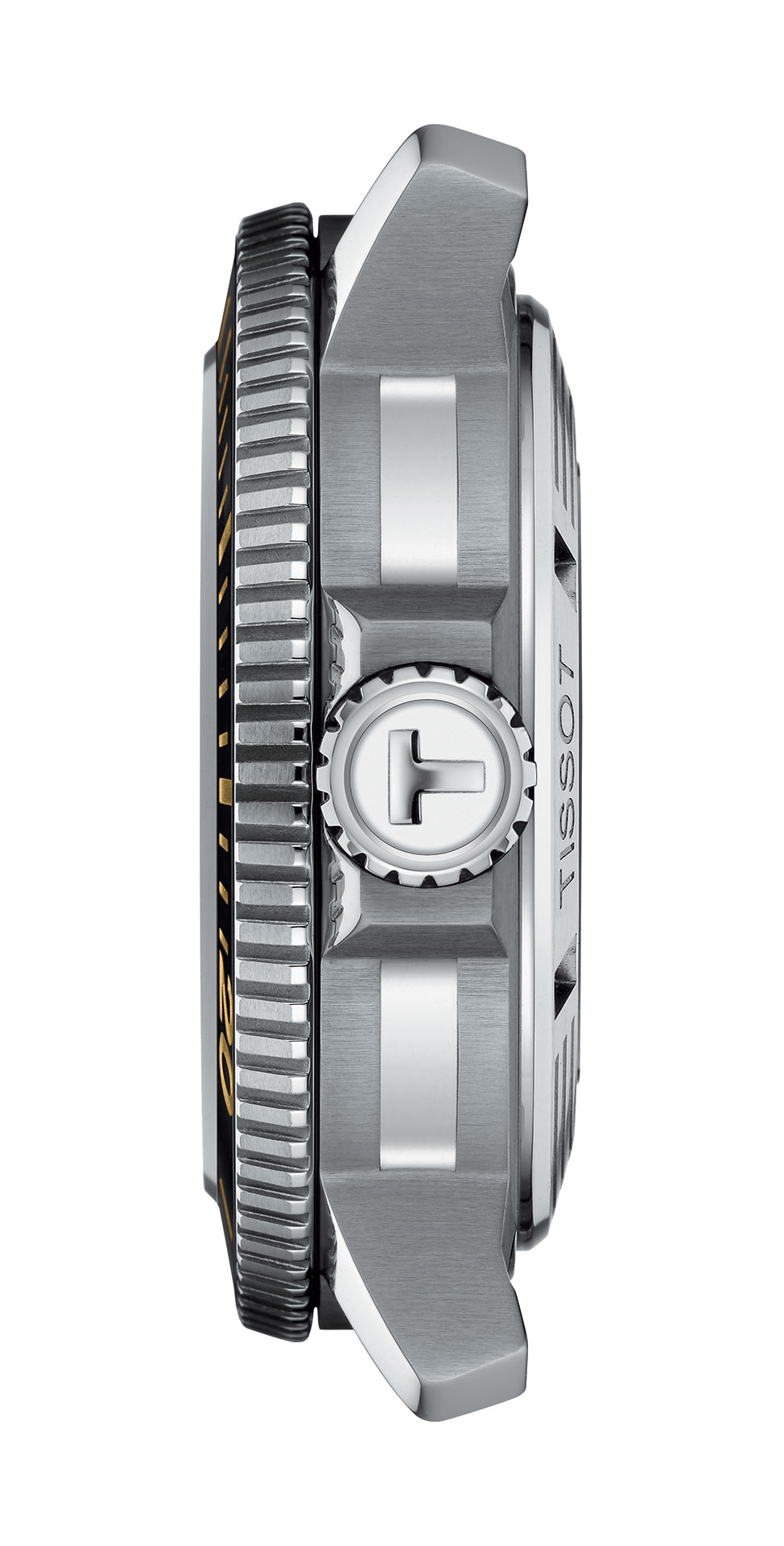 Tissot Seastar 2000 splní extrémní požadavky a fanouškům podvodního průzkumu nabídne vysokou odolnost proti vodě, dosahující 60 barů / 600 metrů. Jeho odolné nerezové pouzdro o průměru 46 mm má automatický heliový ventil, šroubovací a skleněná záda pouzdra a šroubovací korunku. Na horní část pouzdra umístil Tissot jednosměrně otočnou lunetu s keramickou vložkou odolnou proti poškrábání. Aby osvětlil čas, vybavil pozlacené ručičky a ukazatele hodin ve tmě svítící Super-LumiNova®, zajišťující viditelnost za všech podmínek.