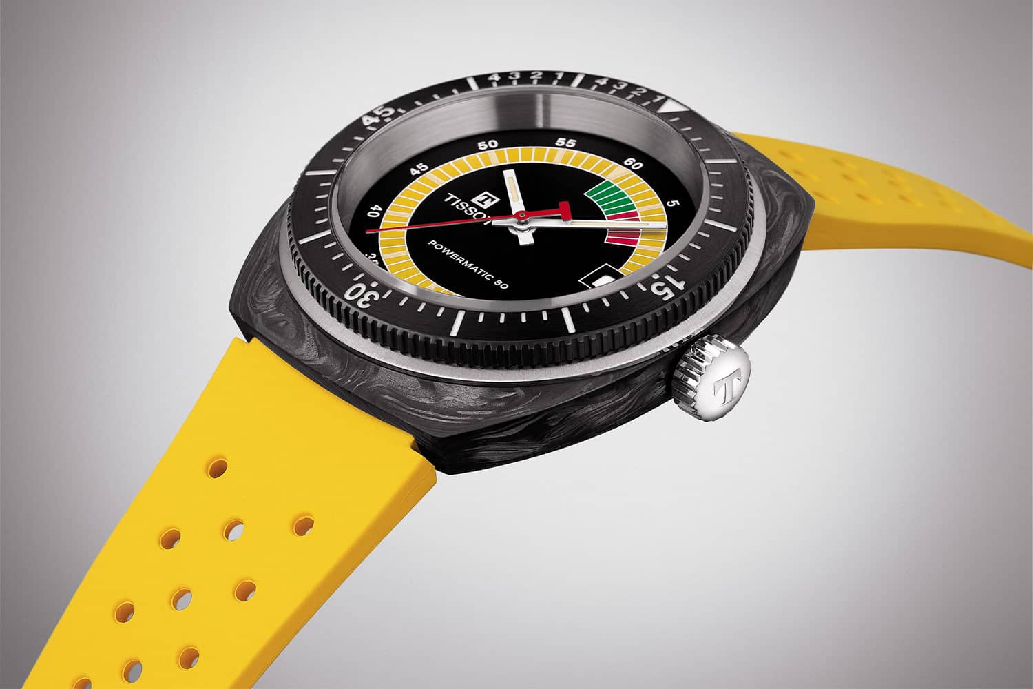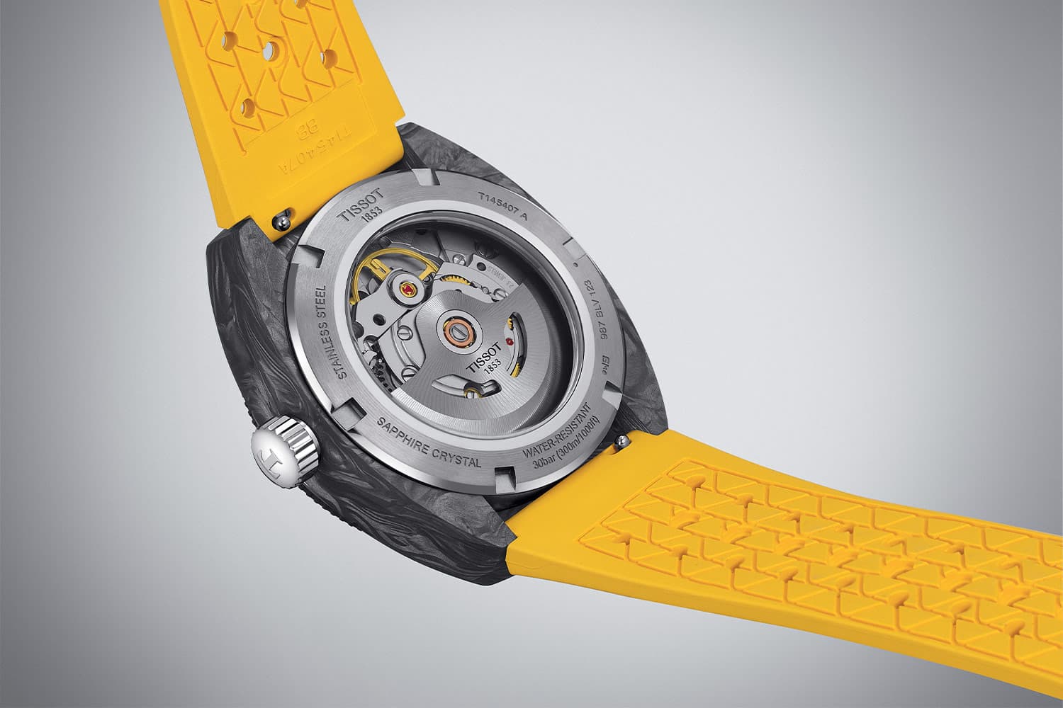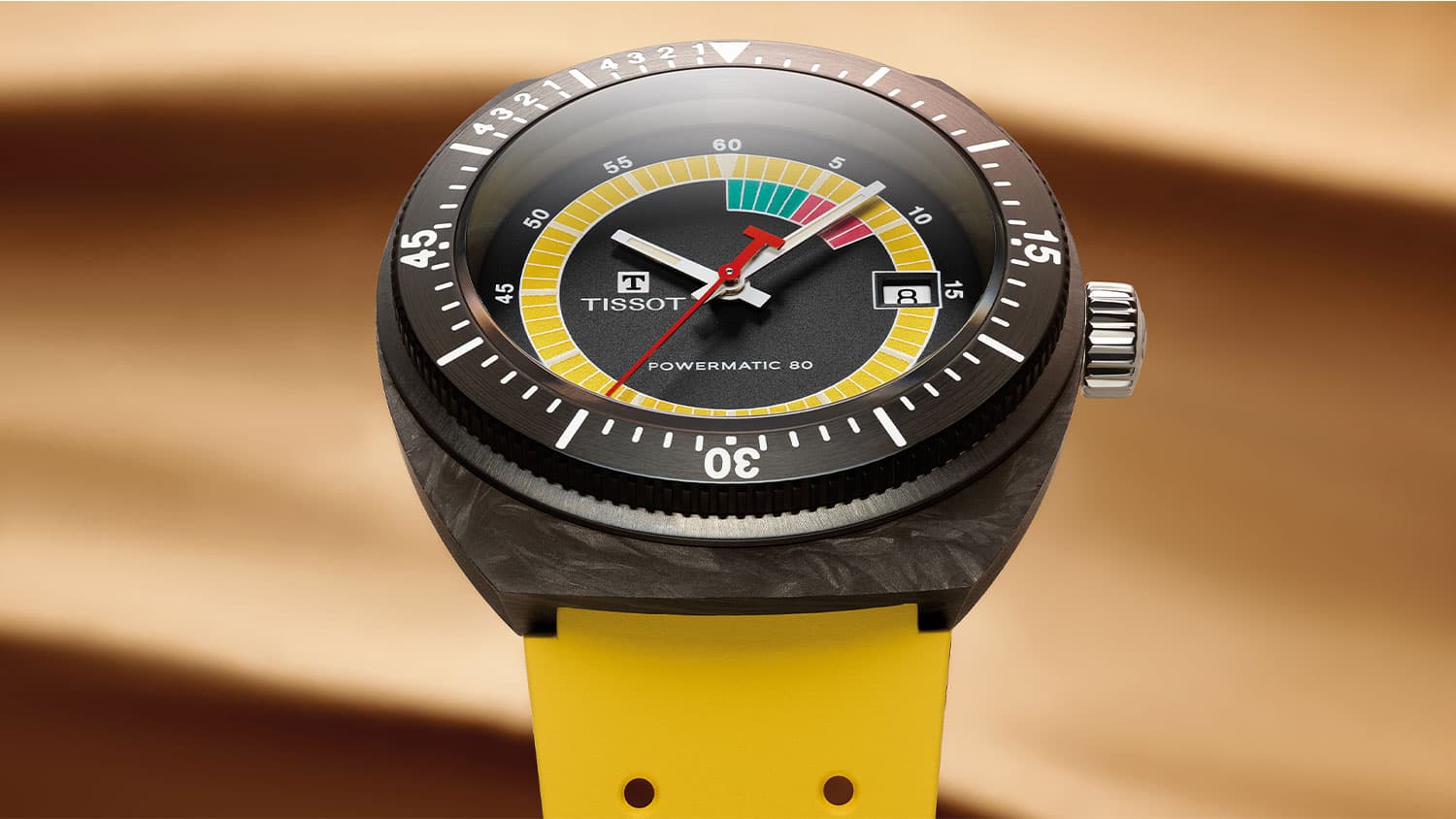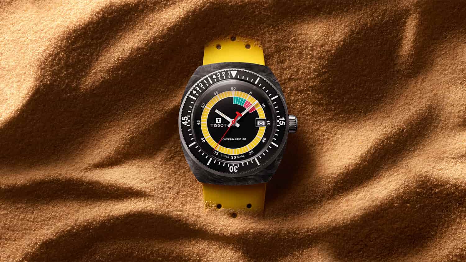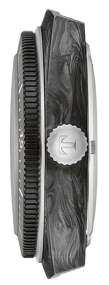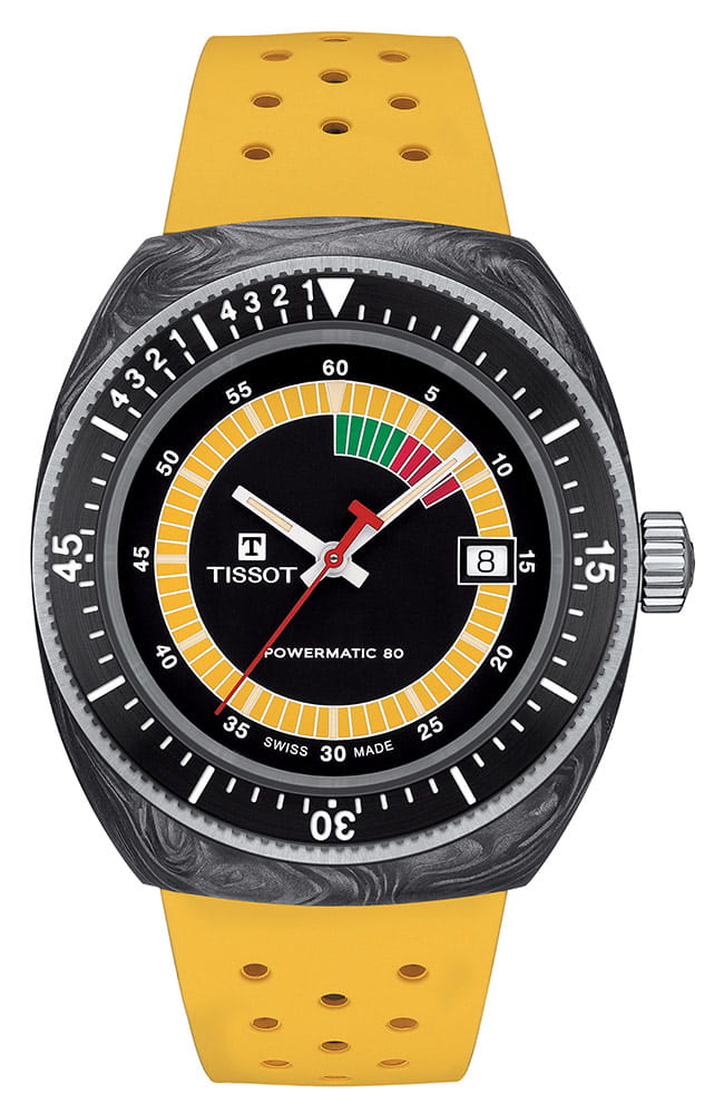 Retro hodinky Tissot Sideral S Powermatic 80 T145.407.97.057.00 jsou uloženy v unikátním pouzdru tonneau vyrobeném z lehkých uhlíkových vláken. Textura mramoru na pouzdře učiní každé hodinky jedinečnými a neopakovatelnými. Hodinky byly utěsněny až na 300 metrů, což zajišťuje bezpečnost při potápění. Dalšími bezpečnostními prvky jsou šroubovací korunka umístěná na pravé straně pouzdra a šroubovací víko na jeho zadní straně. Přední je otočný jednosměrný dalekohled se stupnicí, která usnadňuje sledování ubíhajících minut, například při ponoření. Hodinky byly kombinovány s gumovým páskem se zapínáním na dva speciální špendlíky. Voděodolný řemínek v letní zářivě žluté barvě je pružný a lehký, což zajistí pohodlí při jeho používání. řemínek Tissot má funkci rychlé výměny bez dalšího nářadí.