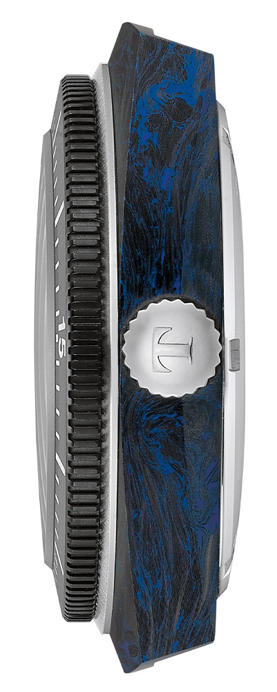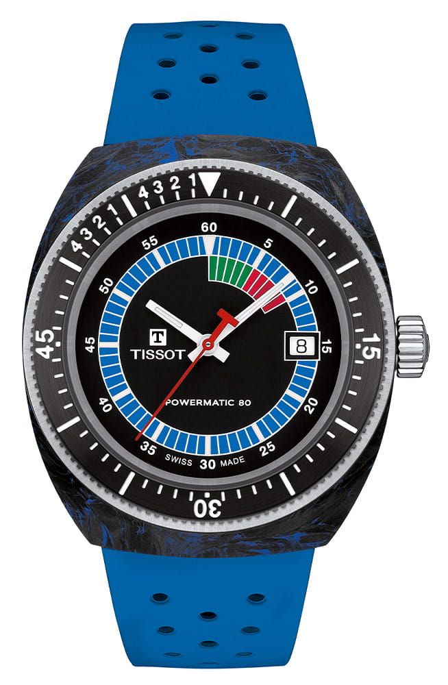 Retro hodinky Tissot Sideral S Powermatic 80 T145.407.97.057.01 jsou uloženy v unikátním pouzdru tonneau vyrobeném z lehkých uhlíkových vláken. Textura mramoru na pouzdře učiní každé hodinky jedinečnými a neopakovatelnými. Hodinky byly utěsněny až na 300 metrů, což zajišťuje bezpečnost při potápění. Dalšími bezpečnostními prvky jsou šroubovací korunka umístěná na pravé straně pouzdra a šroubovací víko na jeho zadní straně. Přední je otočný jednosměrný dalekohled se stupnicí, která usnadňuje sledování ubíhajících minut, například při ponoření. Hodinky byly kombinovány s gumovým páskem se zapínáním na dva speciální špendlíky. Voděodolný modrý řemínek je pružný a lehký, což zajistí pohodlí při jeho používání. řemínek Tissot má funkci rychlé výměny bez dalšího nářadí.