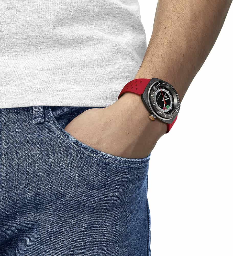 Retro hodinky Tissot Sideral S Powermatic 80 T145.407.97.057.02 jsou uloženy v unikátním pouzdru tonneau vyrobeném z lehkých uhlíkových vláken. Textura mramoru na pouzdře učiní každé hodinky jedinečnými a neopakovatelnými. Hodinky byly utěsněny až na 300 metrů, což zajišťuje bezpečnost při potápění. Dalšími bezpečnostními prvky jsou šroubovací korunka umístěná na pravé straně pouzdra a šroubovací víko na jeho zadní straně. Přední je otočný jednosměrný dalekohled se stupnicí, která usnadňuje sledování ubíhajících minut, například při ponoření. Hodinky byly kombinovány s gumovým páskem se zapínáním na dva speciální špendlíky. Voděodolný řemínek v kontrastní červené barvě je pružný a lehký, což zajistí pohodlí při jeho používání. řemínek Tissot má funkci rychlé výměny bez dalšího nářadí.