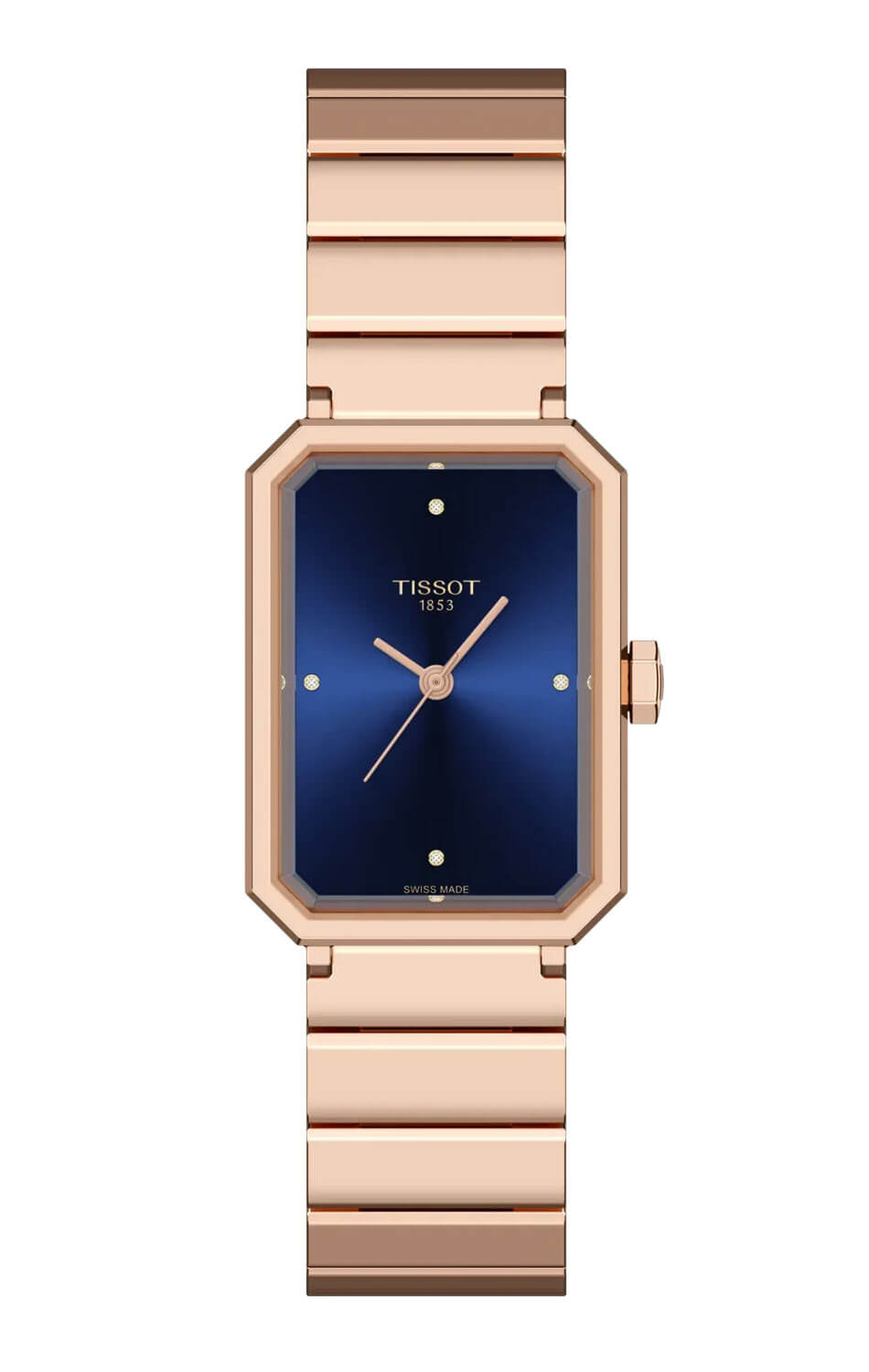 Pouzdro o rozměru 21,80 mm a náramek jsou vyrobeny z ušlechtilé oceli potažené zlatou vrstvou PVD, což zaručuje dlouhotrvající lesk a odolnost. Modrý číselník s efektem slunečních paprsků vytváří výrazný kontrast s diamantovými indexy a celek doplňuje švýcarský quartzový strojek vybavený ukazatelem End Of Life, který upozorňuje na nutnost výměny baterie. Obdélníkové hodinky Tissot Diamonds T160.110.33.046.00 na náramku jsou volbou, která v sobě spojuje estetiku a spolehlivost ve stejném poměru.