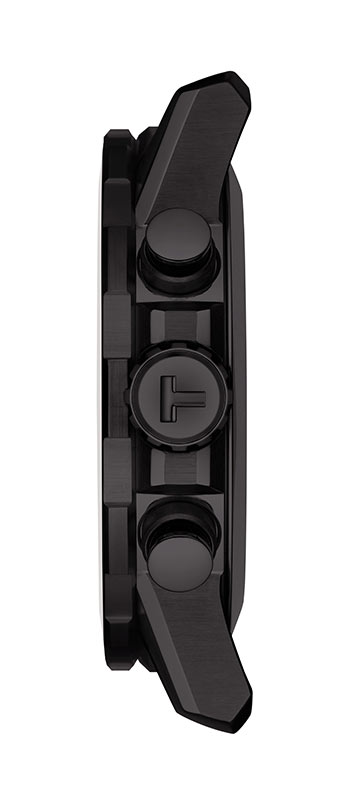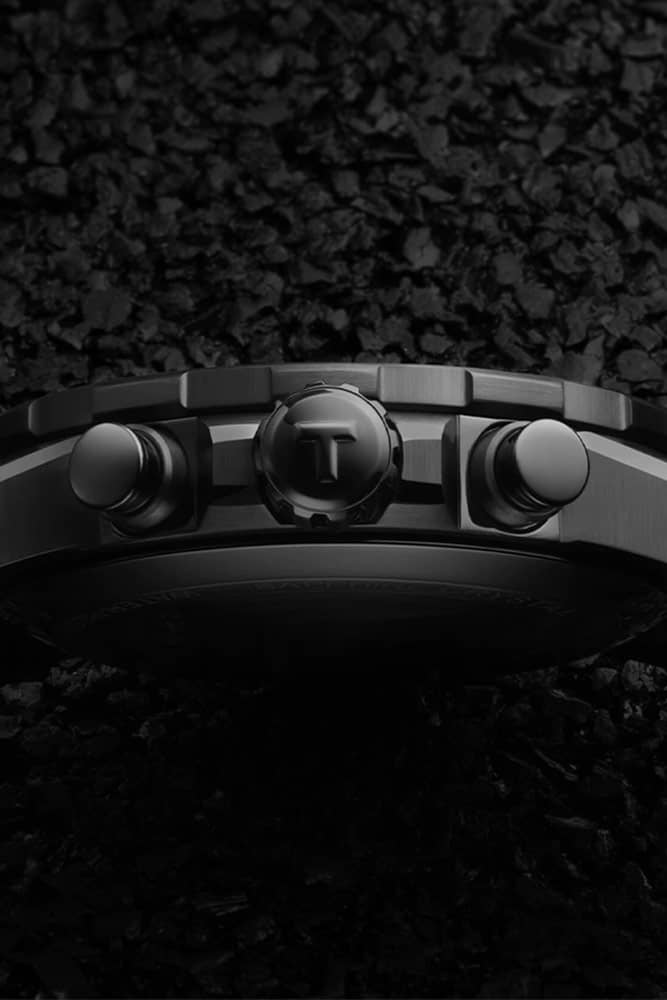 Dělicí indexy zajišťují lepší čitelnost indikací a dodávají ciferníku hloubku, chráněnému vysoce odolným, vysoce kvalitním safírovým sklem. Paleta barev je omezena pouze na dvě složky, kterými jsou bílá a černá. Dvě zcela opačné barvy, ze kterých se designérům Tissot podařilo vyvinout plodnou symbiózu. Tento kontrastní pás, vždy přítomný ve světě sportu, dodává hodinkám jistou nótu elegance, aktuálnosti, univerzálnosti a také spoustu výhod ovlivňujících orientaci v čase a rychlost jeho čtení. Na sluncem broušeném ciferníku jsou kromě tradiční hodinové stupnice také 3 subčíselníky odpovídající komplikacím stopek a vteřinové ručičky. Prostor dalekohledu je účelně uspořádán tak, že je na něj umístěn tachymetr sloužící k určení rychlosti ujeté na vzdálenost 1 kilometru (vyjádřeno v km/h). Pouzdro i náramek jsou vyrobeny z úžasně odolné a nerezové oceli odolné proti korozi a poškrábání. Jeho povrch byl pokryt černou vrstvou, za použití technologie PVD. Tato metoda zaručuje dlouhodobou otěruvzdornost nátěrů, což potěší ty, kteří přikládají velký důraz na estetickou stránku.