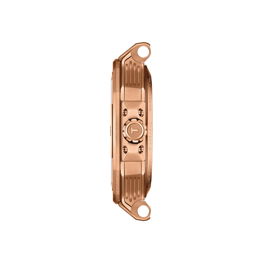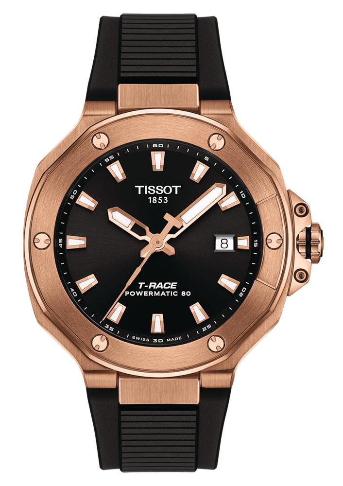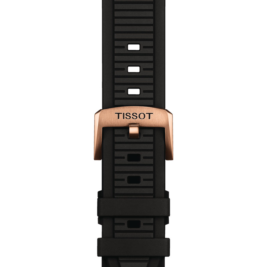 Pánské hodinky Tissot T-Race Powermatic 80 T1418073705100 jsou k dispozici v rozměru 41 mm. Pouzdro ze nerezové oceli ve zlatém PVD odstínu je obohaceno o detaily inspirované světem motorek. Pozlacený bezel se šesti ozdobnými šrouby a korunková ochrana jsou inspirovány brzdovým kotoučem a jeho upínkem. Zadní strana pouzdra má průhledný kryt, který umožňuje sledování práce mechanismu. Tissot hodinky jsou vodotěsné do hloubky 100 metrů, což zaručuje bezpečnost funkce mechanismu při plavání. Výrobce své automatické hodinky TISSOT T-Race doplnil o elastický gumový řemínek, který zajistí pohodlí při nošení.