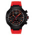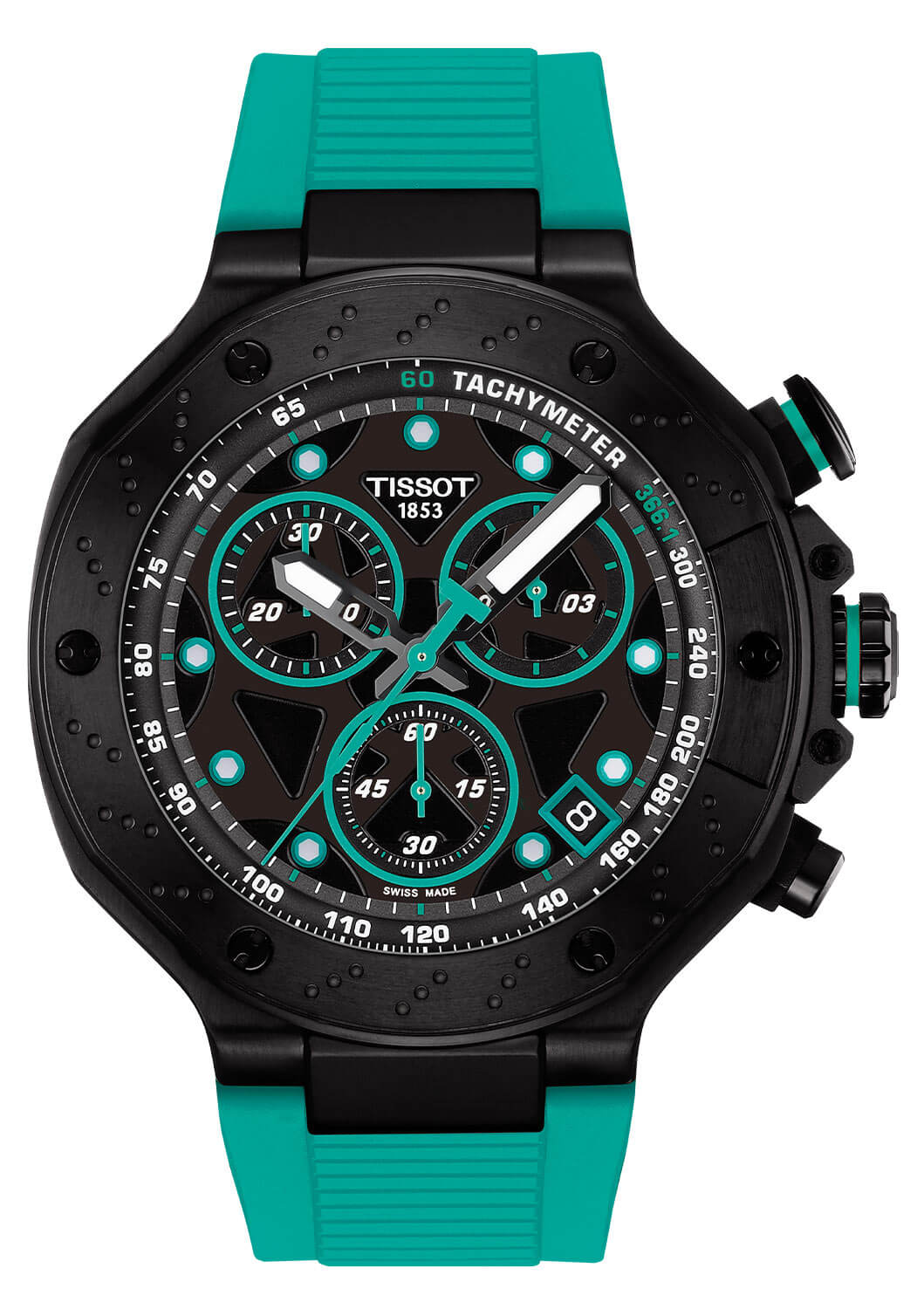 Moderní, dynamický design hodinek čerpá inspiraci z dlouholetého partnerství Tissot s motocyklovými závody. Jeho 45 milimetrové pouzdro, vyrobené z nejvyšší třídy oceli 316L a potažené černou PVD vrstvou, vyzařuje drsnou elegancí a sportovním charakterem. Černé pozadí ciferníku harmonizuje s precizně vyrobenými indexy a ručičkami, které díky luminescenci Super‑LumiNova® zajišťují vynikající čitelnost i při slabém osvětlení. Navíc safírové sklíčko s antireflexní vrstvou zaručuje nejen čitelnost, ale také odolnost vůči poškrábání, a vodotěsnost do 100 metrů umožňuje volné plavání.