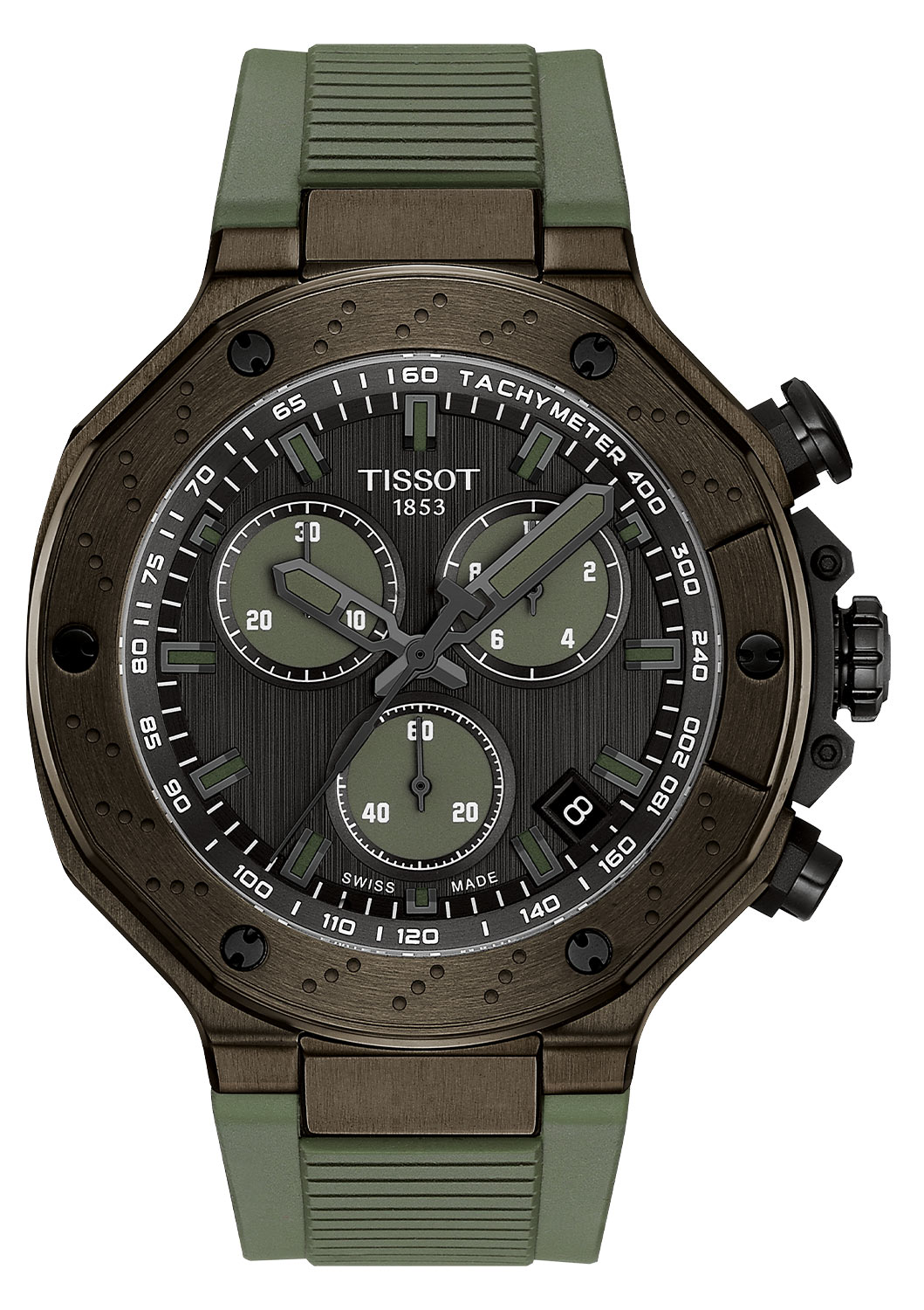 Švýcarské hodinky Tissot T1414173706102 s chronografem se vyznačují 45mm pouzdrem z nerezové oceli 316L, pokrytým tmavě zelenou PVD vrstvou, která mu dodává surový, ale stylový vzhled. Ciferník v tmavě šedé barvě harmonizuje s zelenými ručičkami a indexy, vytvářejícím sportovní a moderní vzhled. Dodatkem je safírové sklo odolné proti poškrábání s antireflexní úpravou, které zajišťuje trvanlivost a jasnost čitelnosti za všech podmínek. Sportovní estetiku dotváří zelený silikonový řemínek s pohodlnou sponou, který nejen skvěle vypadá, ale také zajišťuje komfort při nošení.