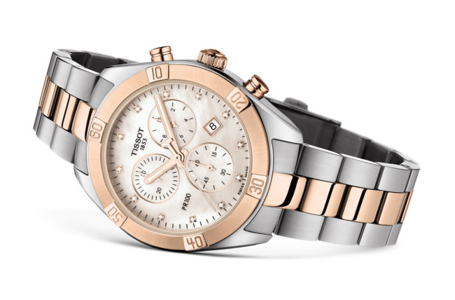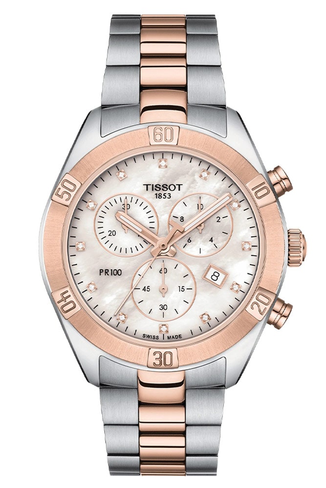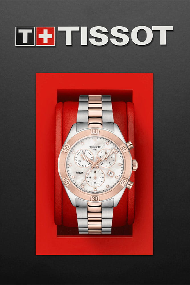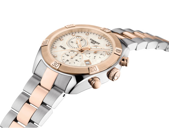 Tissot PR 100 Sport Chic Lady Chrono T101.917.22.116.00 je sportovní verze hodinek Tissot PR 100 pro dámy. Prestižní edice s diamanty! Kombinace sportu a elegance, velké pouzdro z nerezové oceli korunované rámem s arabskými číslicemi. Čitelný číselník s indexy, na kterých je luminiscenční látka, byl obohacen o přesný chronograf. Třída vodotěsnosti 100 m znamená, že ji nemusíte sundávat kvůli plavání. Věrný svému názvu je nový Tissot PR 100 přesný a působivý. Moderní design v kombinaci s vysokou voděodolností a novým, velmi odolným náramkem s pohodlným zapínáním na knoflík. Dynamické ručičky pokryté vrstvou luminiscenční látky Super-LumiNova umožňují čitelnost v podmínkách naprosté tmy.