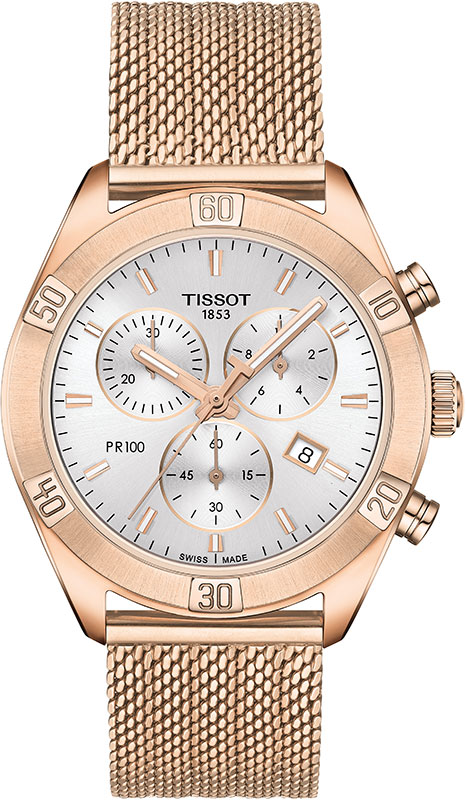 Tissot PR 100 Sport Chic Lady Chrono T101.917.33.031.00 je sportovní verze hodinek Tissot PR 100 pro dámy. Kombinace sportu a elegance, velké pouzdro z nerezové oceli, zlacené PVD růžovým zlatem, korunované lunetou s arabskými číslicemi. Čitelný ciferník stříbrné barvy s indexy, na kterých je luminiscenční látka, byl obohacen o přesný chronograf. Třída těsnění 10 bar/100 M znamená, že jej nemusíte kvůli plavání sundávat. Věrný svému názvu je nový Tissot PR 100 přesný a působivý. Moderní design v kombinaci s vysokou voděodolností a velmi pohodlným síťovaným náramkem. Dynamické ručičky pokryté vrstvou luminiscenční látky Super-LumiNova umožňují čitelnost v podmínkách naprosté tmy.