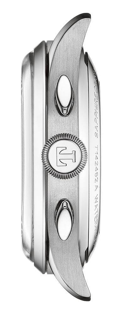 Pánské retro sportovní hodinky Tissot T142.462.16.032.00 jsou umístěny v pouzdře s novým větším než Originním průměrem 42 mm . Jeho povrch se z velké části vyznačuje lesklým povrchem, ale obsahuje i některé kartáčované prvky. Z horní strany je kombinován s vypouklým safírovým sklem odolným proti poškrábání. Tento model má stříbrný bi-compax číselník. Tachometr (červený) umístěný v jeho střední části slouží k měření rychlosti na známou vzdálenost, zatímco telemetr (modrý) slouží k měření vzdálenosti v situaci, kdy je jev nejprve vidět a pak slyšet. Design se navíc skládá ze dvou dílčích číselníků – 60sekundového ukazatele na hodinách. 9 hodin a 30minutový chronograf 3.