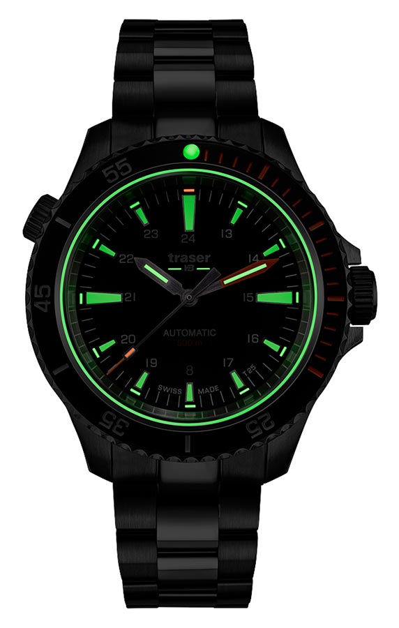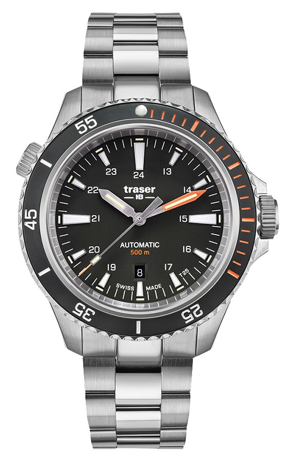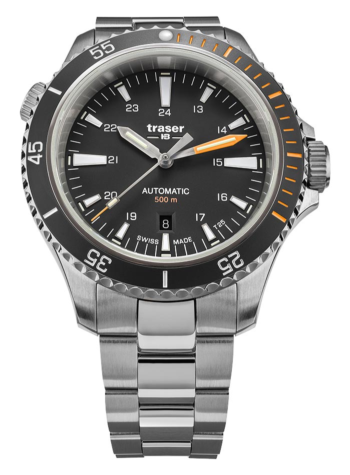 Nová edice profesionálních outdoorových diverských hodinek traser® je nyní k dispozici se švýcarským mechanickým Machinekem s automatickým samonatahovacím Machinekem! Pánské hodinky Traser P67 Diver Automatic Black T25 110324 jsou dlouho očekávaným mechanickým nástupcem quartz modelu P67 SuperSub. Stejně jako jeho předchůdce splňuje přísné normy ISO 6425, které definují požadavky na profesionální diverské hodinky. Jeho působivé, 46 mm a do 500 metrů voděodolné pouzdro z vysoce kvalitní nerezové oceli je vybaveno heliovým ventilem a speciálně chráněnou korunkou. Ciferník je skvěle čitelný jak ve dne, tak v noci, stejně jako 500 metrů pod hladinou moře, za což vděčí nejen efektnímu designu, ale především inovativní technologii trigalight® , která poskytuje soběstačný zdroj světla. . Jedná se o ideální nabídku pro profesionální divere, všechny hledače a průzkumníky, jejichž nedostupnost jen více přitahuje sportovce a outdoorové nadšence. Hodinky jsou naprosto robustní, snadno ovladatelné, funkční, robustní a atraktivní i pro každodenní použití.